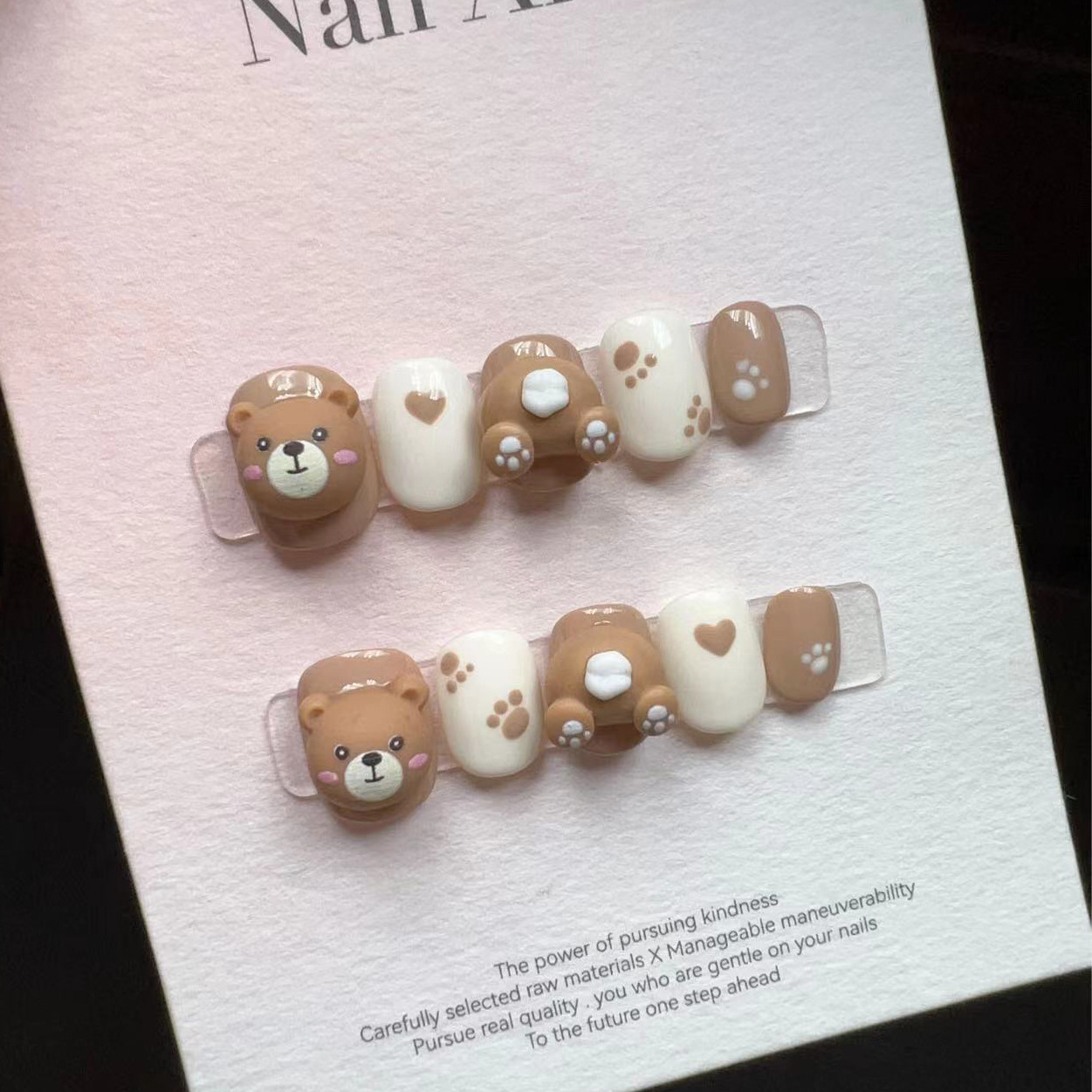 黛瑞森纯手工美甲穿戴甲假指甲贴片可爱咖色屁屁熊日系卡通短款甲
