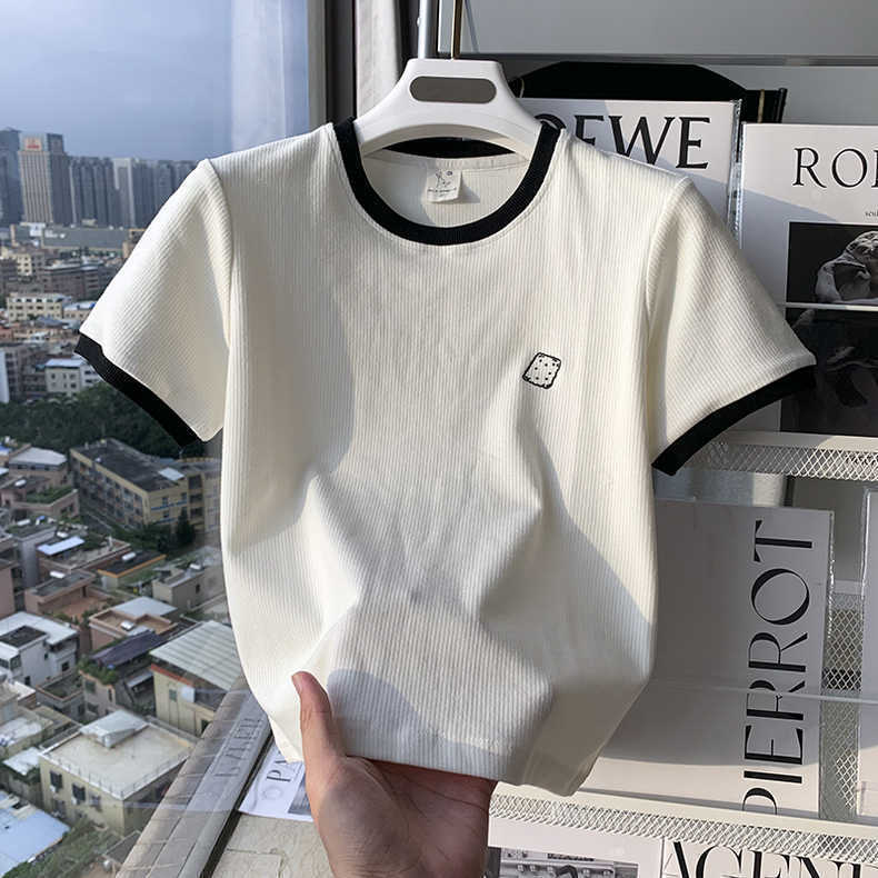 新款撞色边小饼干刺绣坑条T恤正肩短款小宽松短袖女上衣夏季