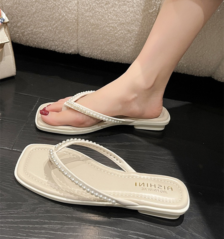 夏季新款平底人字拖女韩版网红方头夹脚时尚珍珠沙滩凉拖鞋女