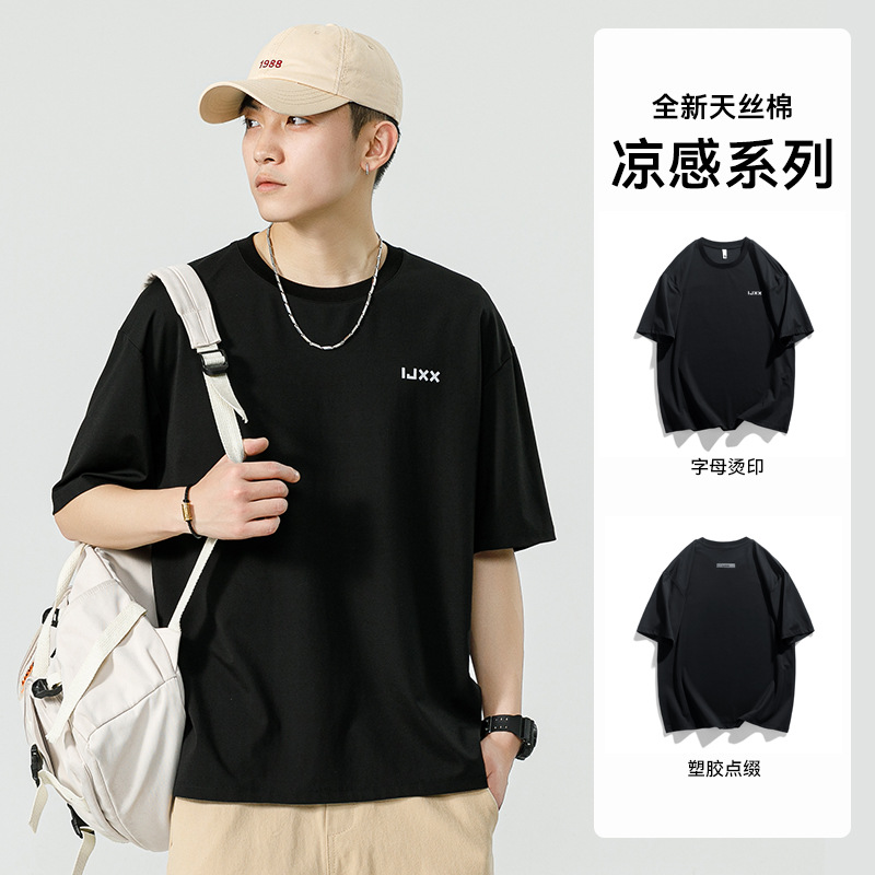 夏季冰丝棉短袖t恤男黑色凉感潮牌圆领宽松男士印花半袖体恤上衣