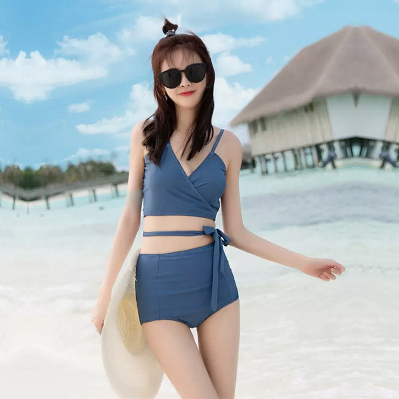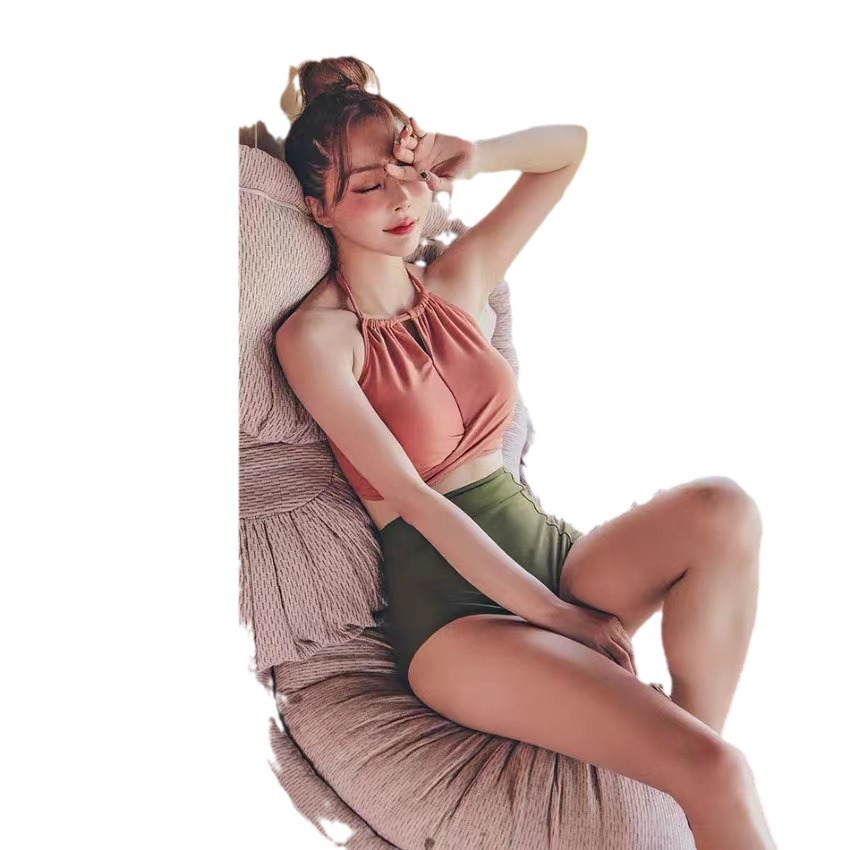 韩国比基尼撞色交叉性感小胸分体两件套高腰游泳衣女温泉沙滩