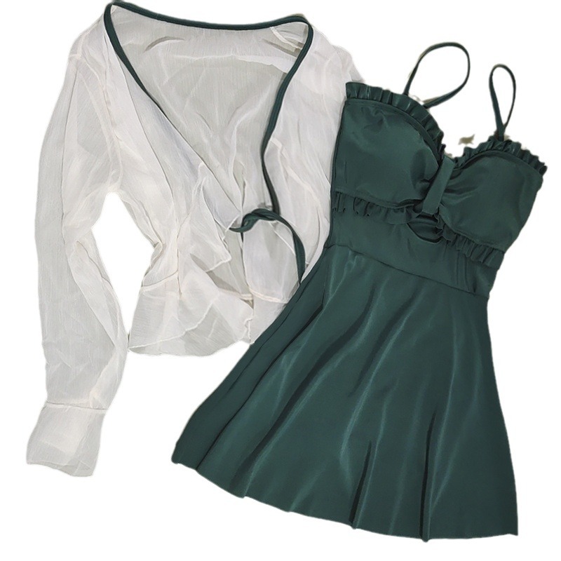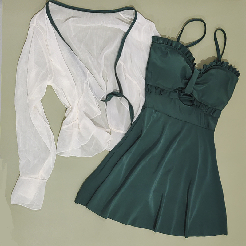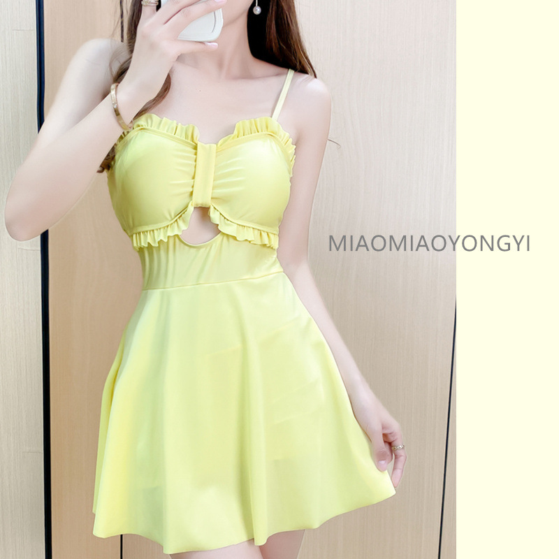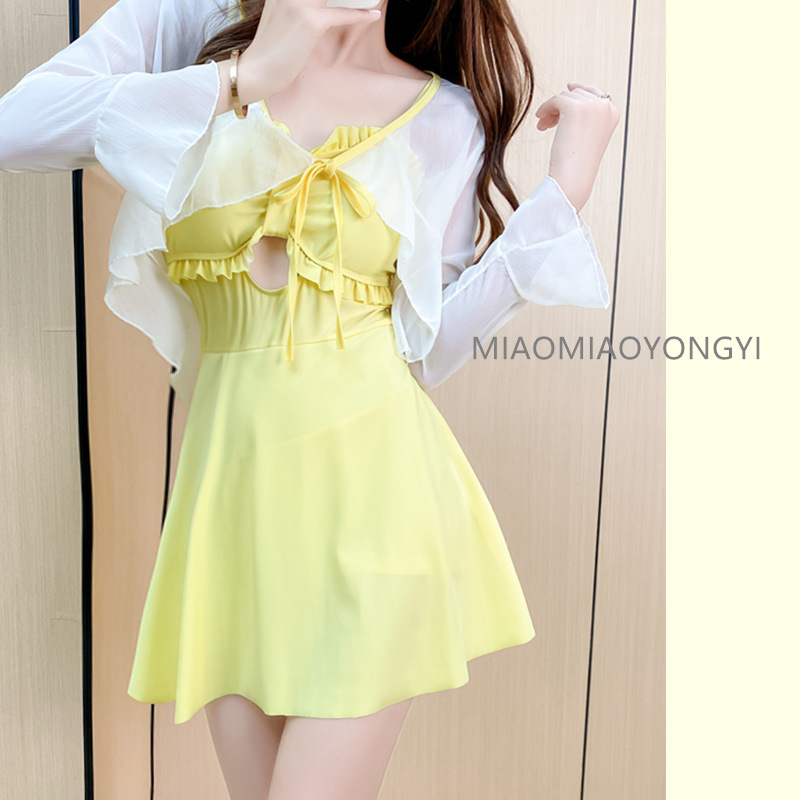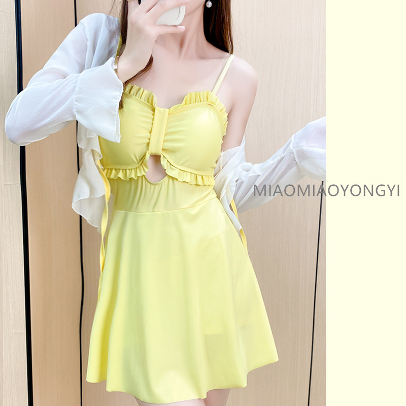 【浪漫满屋】嫩黄泳衣女仙气温泉荷叶边罩衫连体平角保守显瘦泳装