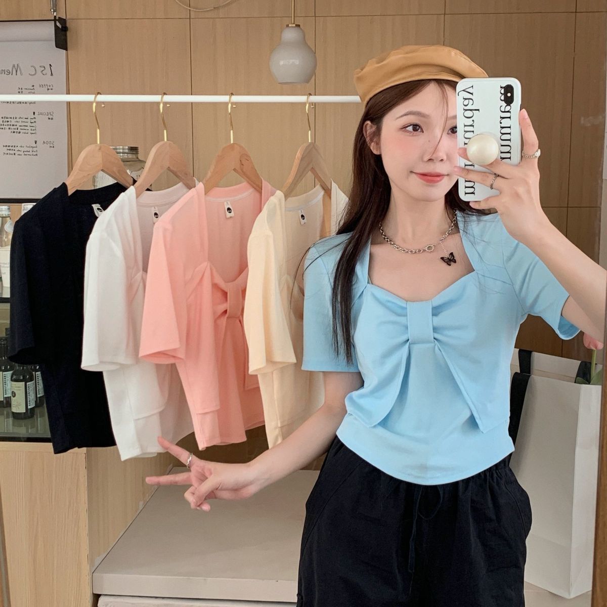 大码胖MM蝴蝶结短袖T恤女新款夏季设计感别致短款方领上衣
