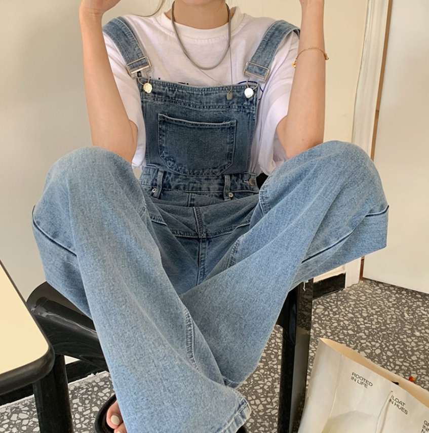 实拍韩国早春新款减龄裤腿破洞牛仔背带拖地长裤女