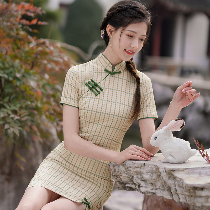 春夏季改良版旗袍日常女装短款格子年轻款少女优雅气质中国风