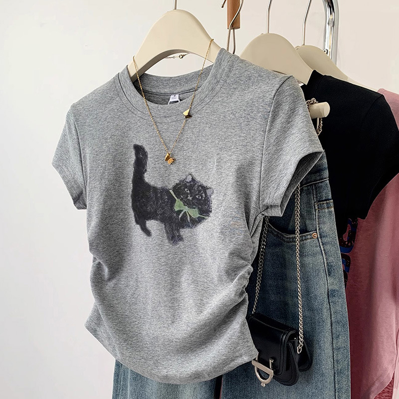 纯棉灰色正肩短袖t恤女夏季新款小个子修身显瘦短款体恤上衣