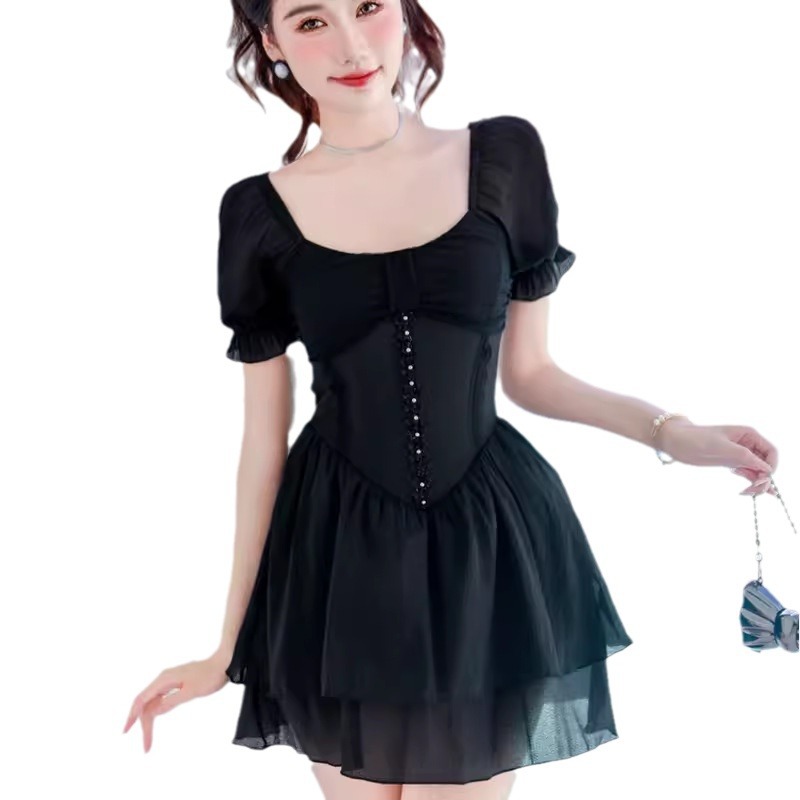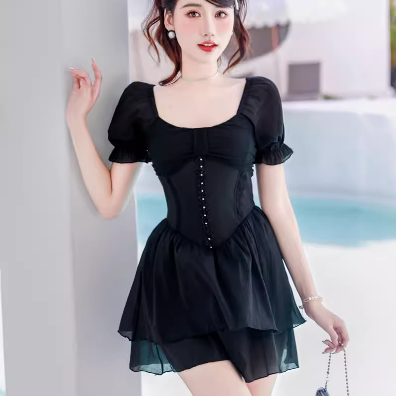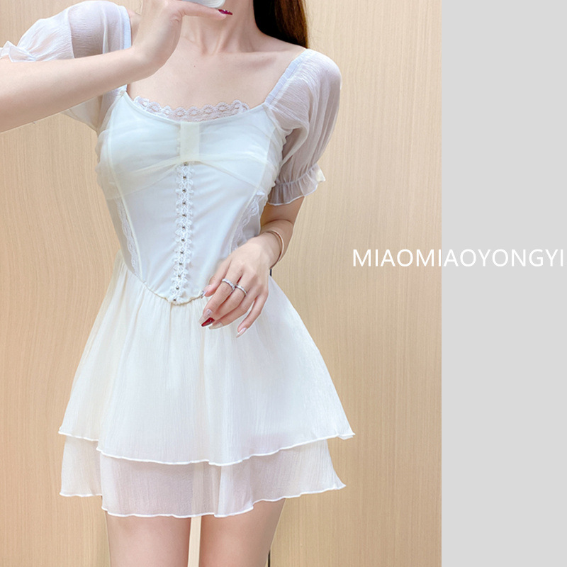 【初夏】仙气游泳衣女连体平角保守显瘦遮肚性感蕾丝遮肚温泉泳装