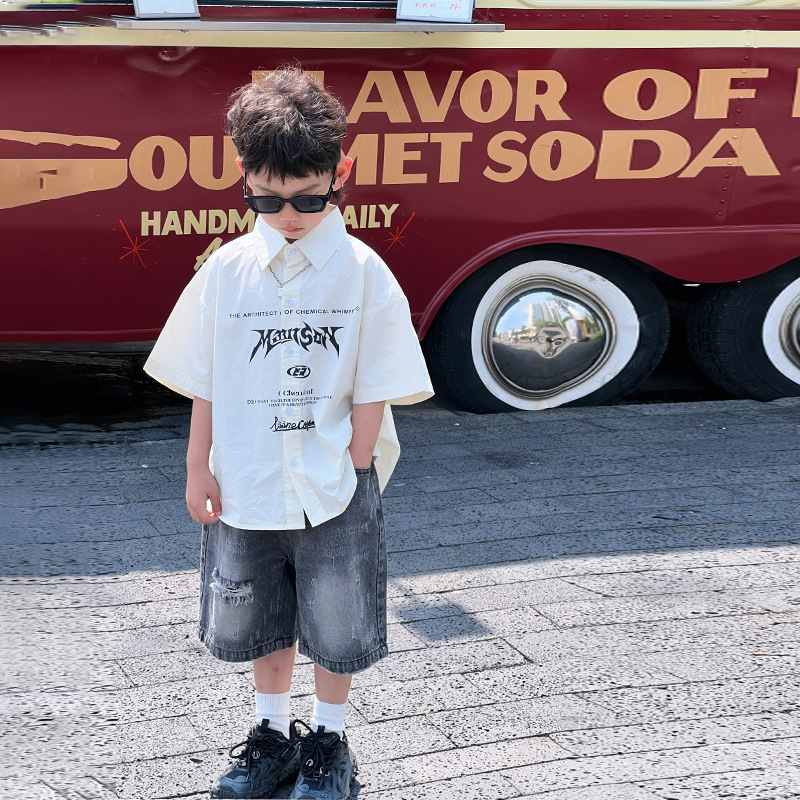 麦可希童装男童短袖衬衫夏季新品韩版中大儿童时尚宽松白衬衫