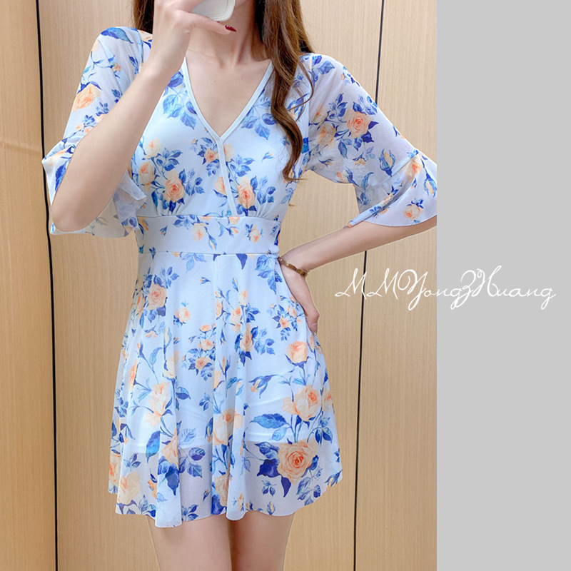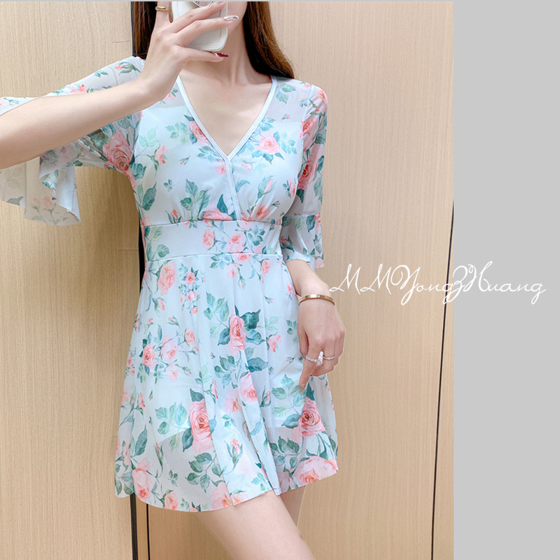新款游泳衣女连体平角保守显瘦遮肚大码温泉长袖韩版性感大版泳装