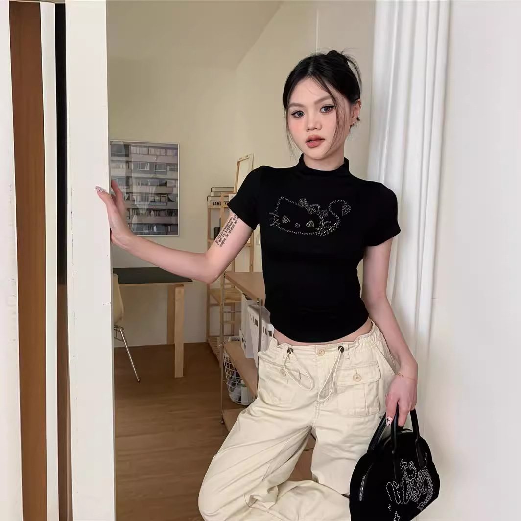 辣妹黑色烫钻半高领短袖T恤女新款夏季露脐紧身短款上衣ins潮欧货