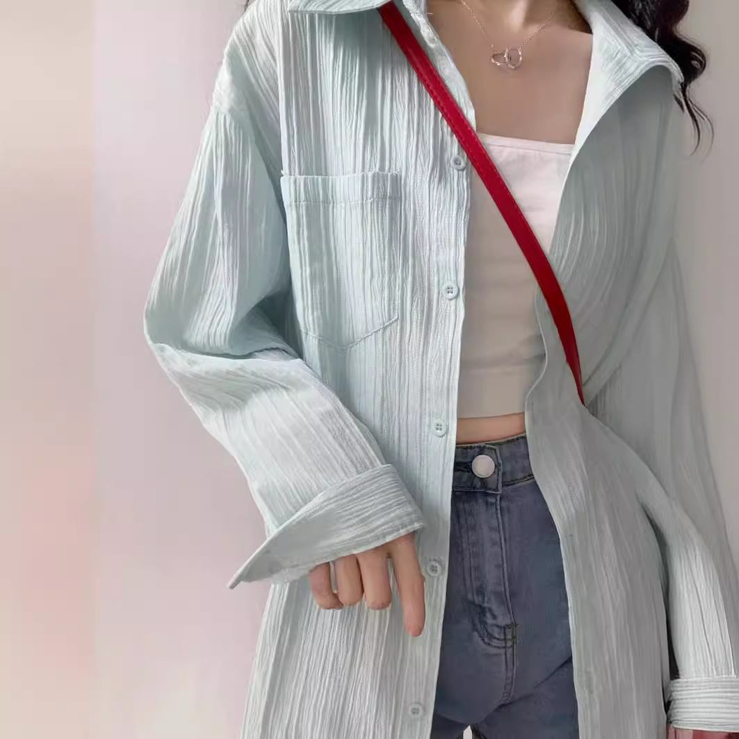 亿涵梦新款小众韩版防晒衬衫设计感女坑条纹舒适宽松版衬衣长袖女