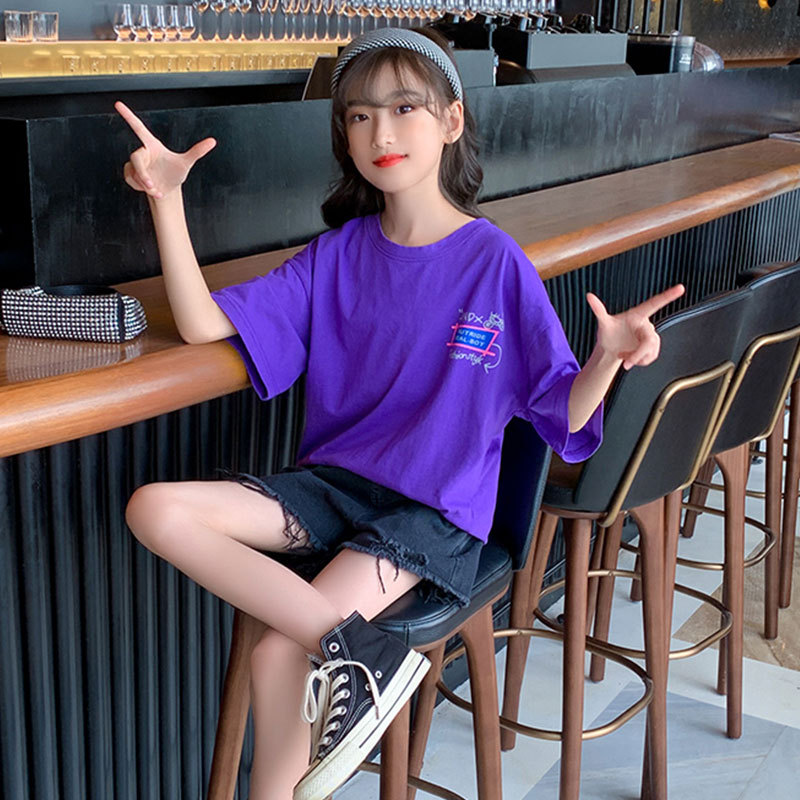 女童棉t恤衫夏中大童短袖上衣前后印花宽松儿童装打底衫