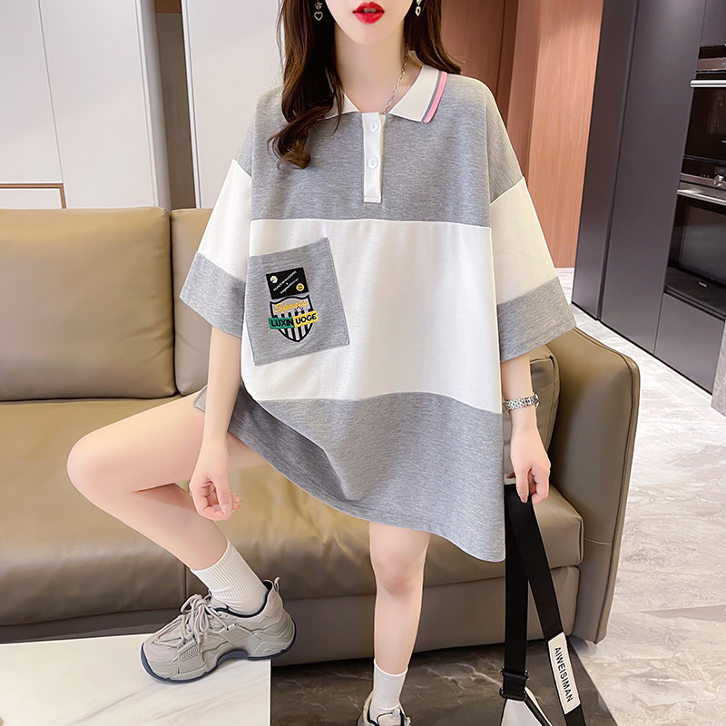 2025新款学院风拼色POLO领中长款短袖T恤女初中生翻领夏装遮屁