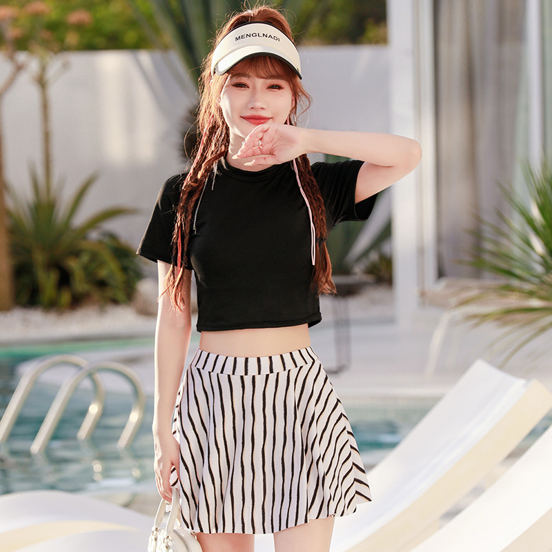 新款游泳衣女分体两件套保守显瘦遮肚少女学生温泉条纹泳装