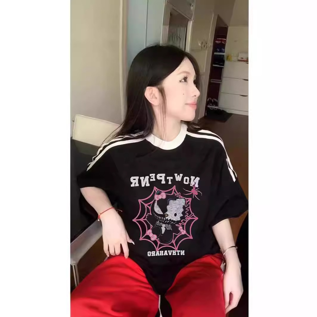 纯棉美式潮牌条纹短袖t恤女夏季新款高街宽松大码别致半袖上衣服