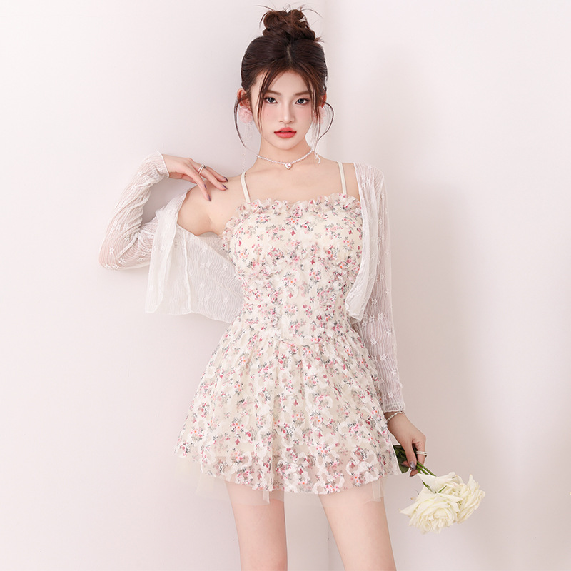 仙气游泳衣女连体平角保守显瘦遮肚韩国性感 网红ins度假蕾丝泳装