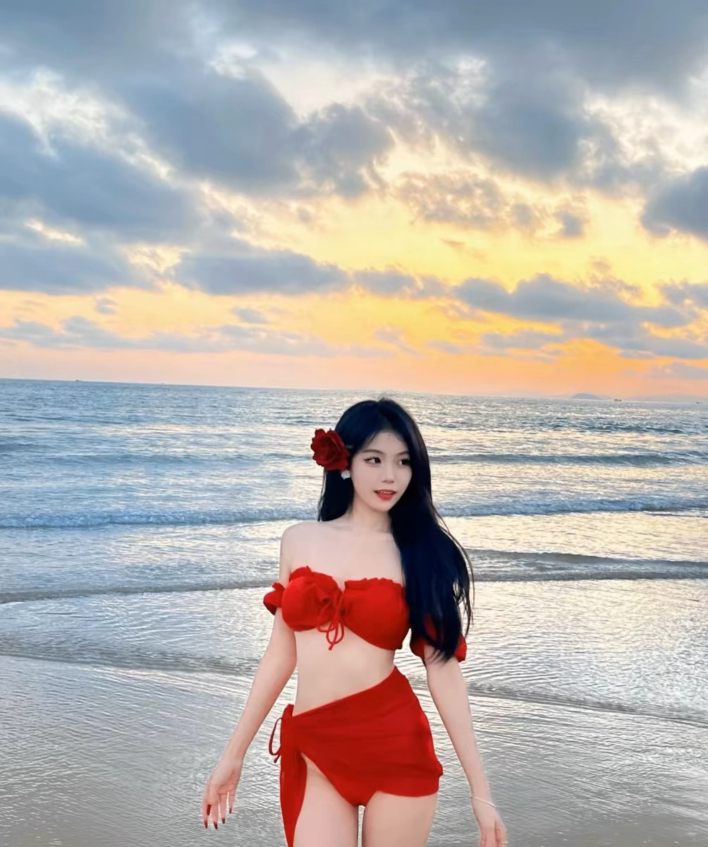 bikini比基尼三件套分体游泳衣女网红新款红色性感温泉度假泳装