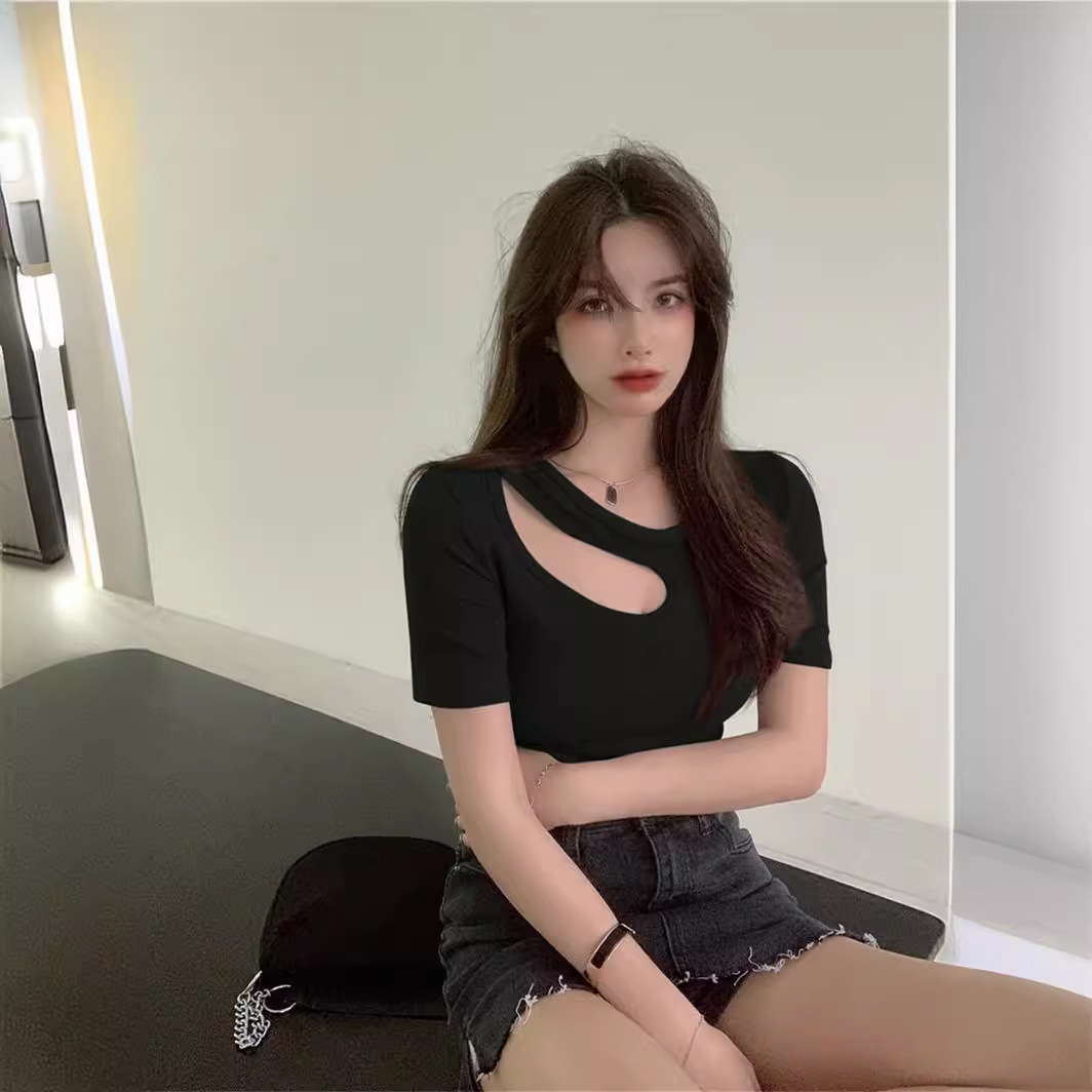 夏季修身辣妹显瘦T恤小众设计感纯色韩版潮流ins短款不规则镂空潮