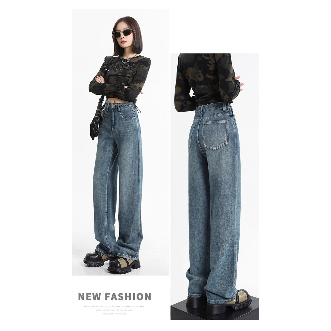 休闲阔腿牛仔裤女春秋冬新款遮肉梨形直筒复古宽松拖地长裤子
