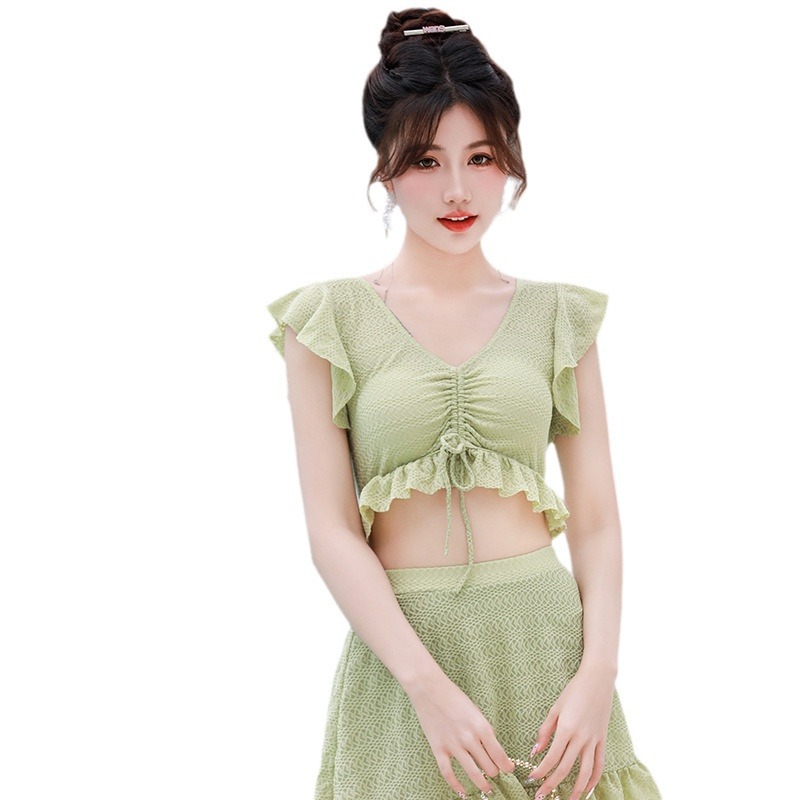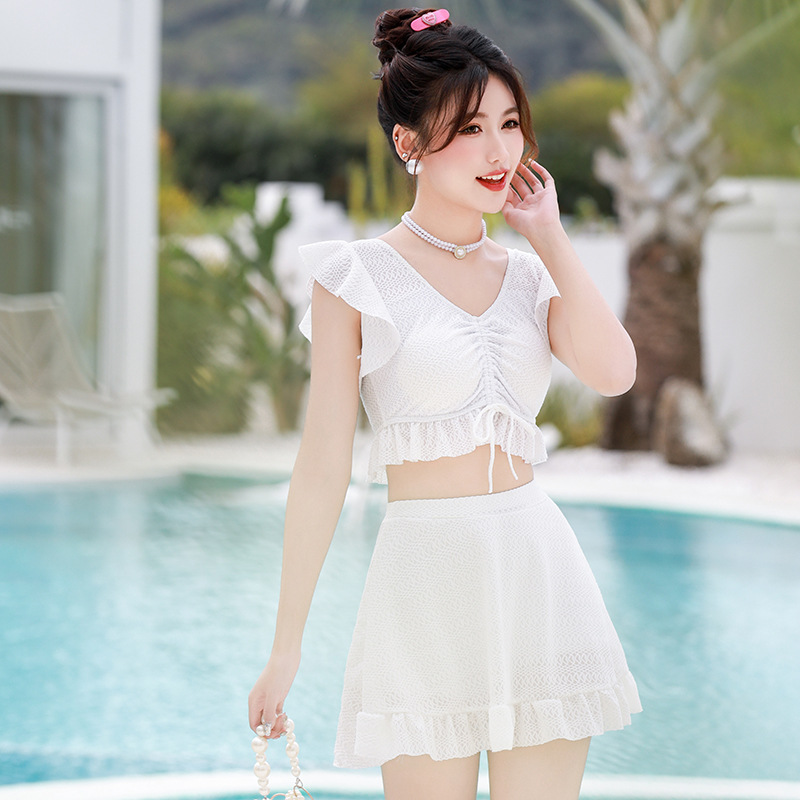 新款游泳衣女夏仙气分体温泉少女小清新学生遮肚保守蕾丝泳装