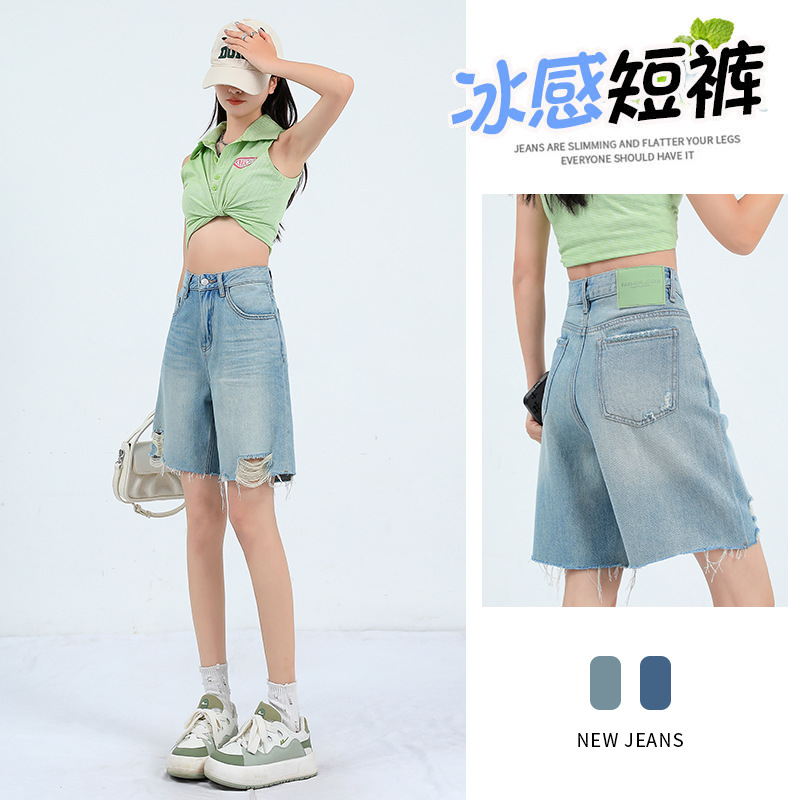2303YKK拉链莱赛尔破洞牛仔短裤女五分裤夏季薄款宽松直筒中裤子