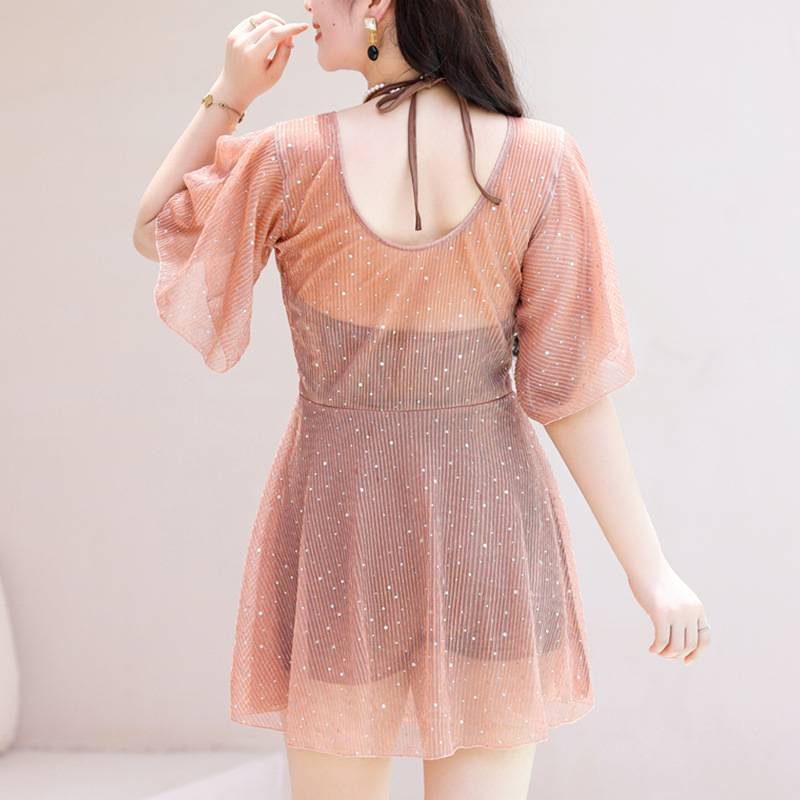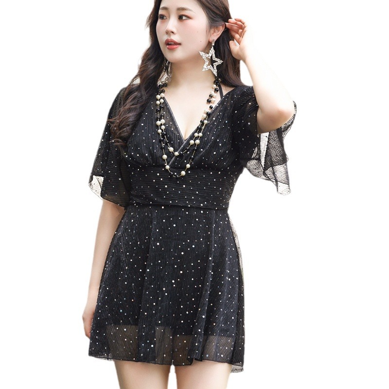 新款胖妹温泉游泳衣女连体平角保守显瘦遮肚微胖遮肚大码泳装