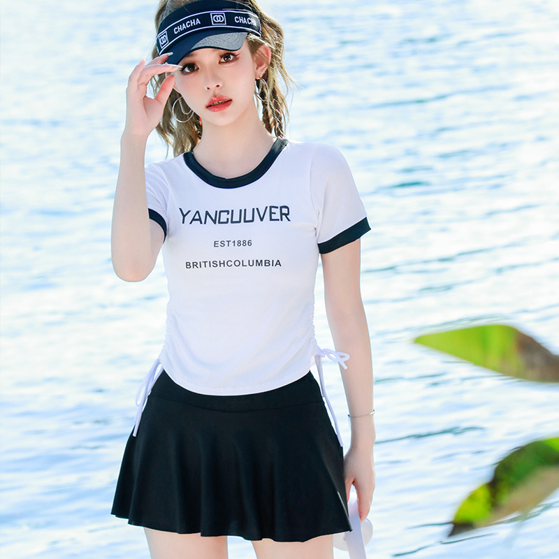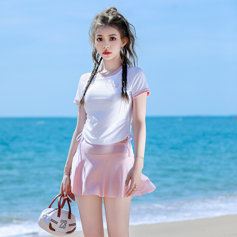甜美可爱少女学生泳衣女分体平角裙式带袖泡温泉保守显瘦遮肚泳装