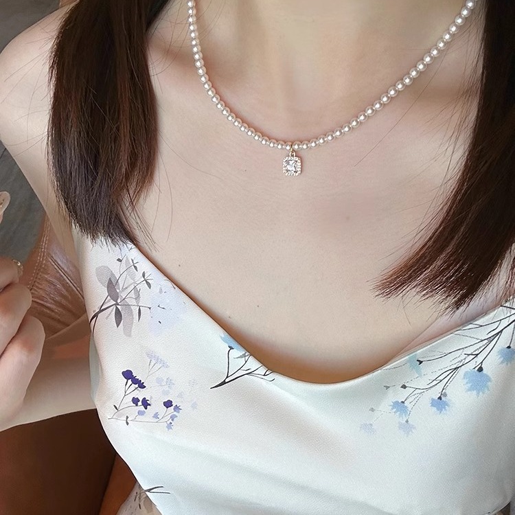 蜜蜂妈 承欢记杨紫同款施家小米珠镶钻方糖吊坠珍珠项链锁骨链女