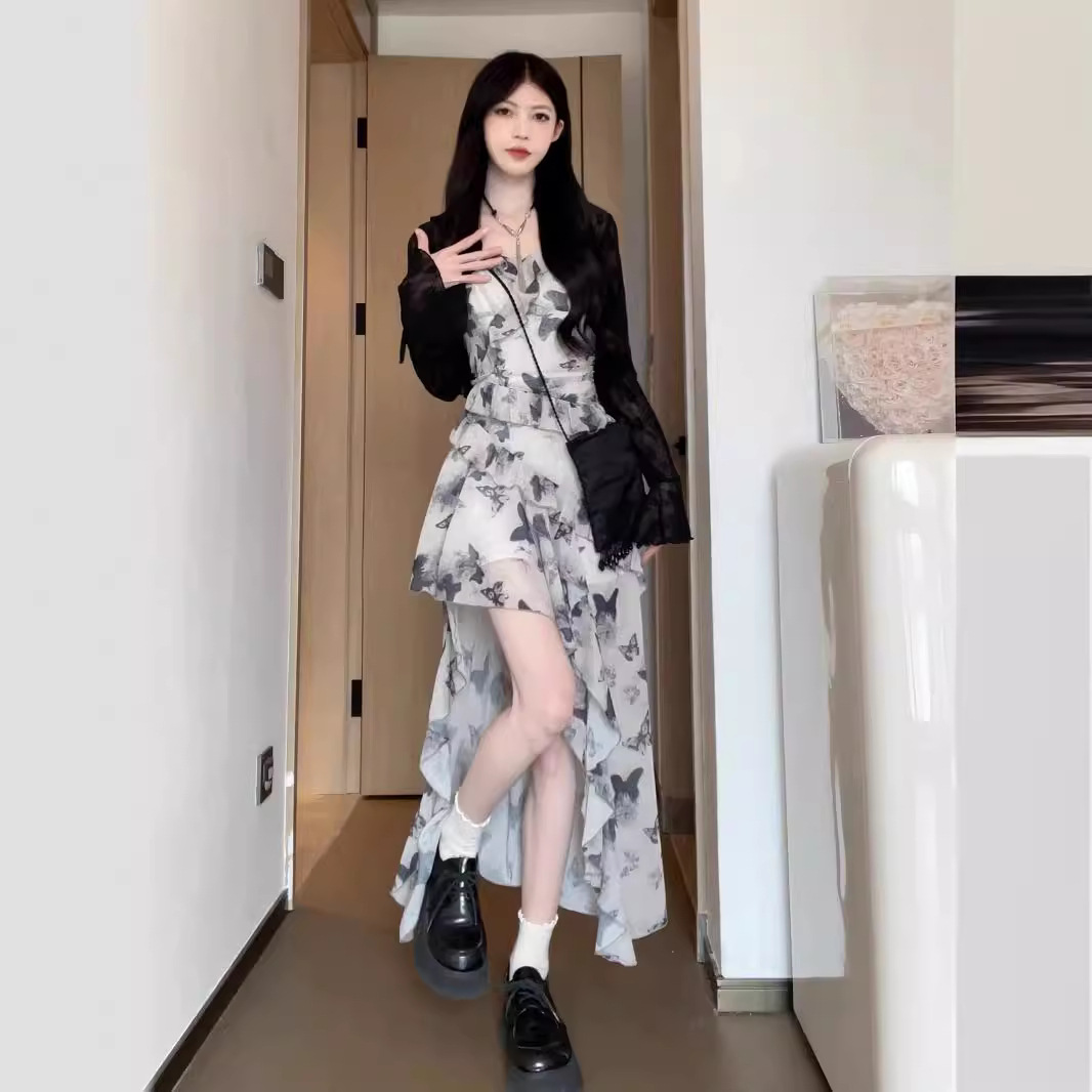 小众设计感碎花蝴蝶不规则吊带裙女春夏秋微胖显瘦长裙洋气连衣裙