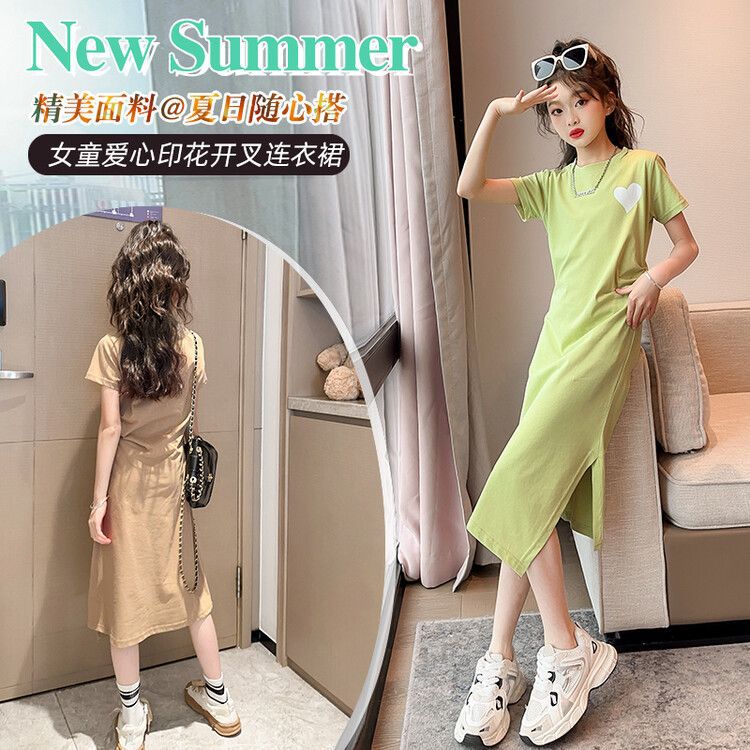 女童连衣裙开叉夏季爱心中大童夏装儿童修身新款韩版洋气长款裙子