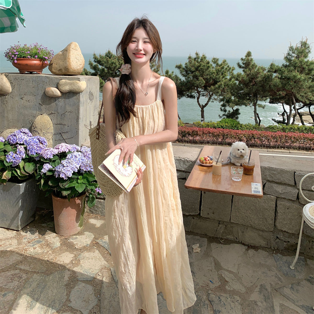米白色度假风吊带裙女中长款夏季新款法式宽松甜美仙女连衣裙