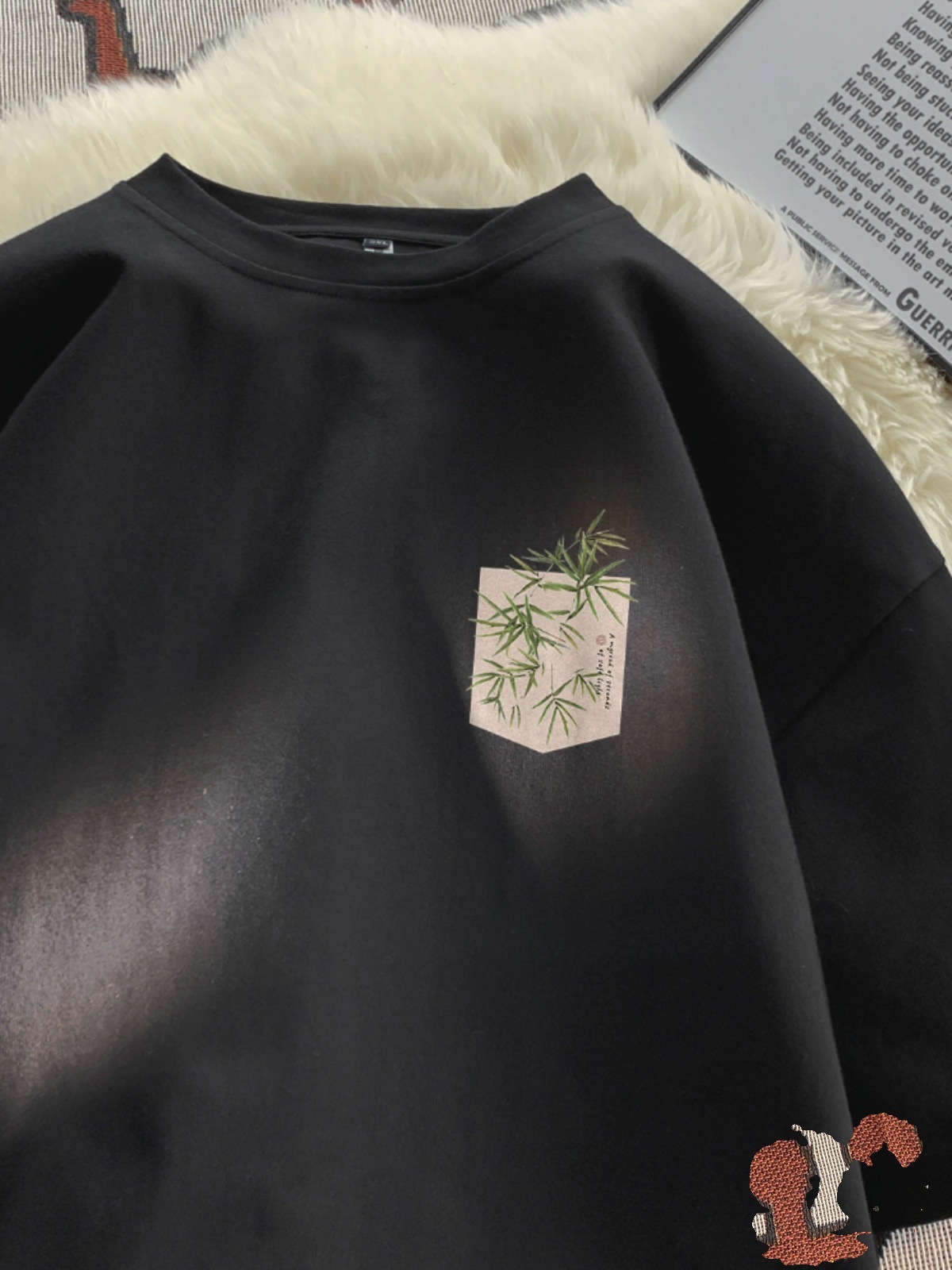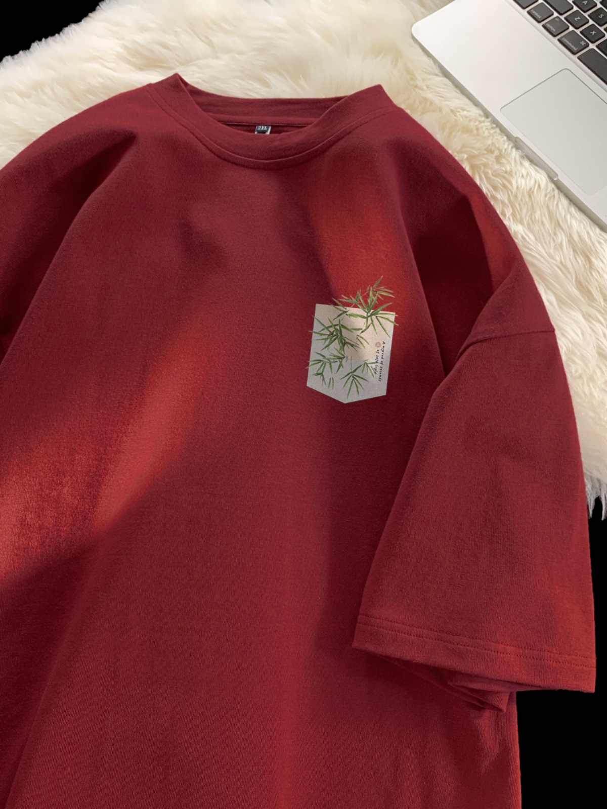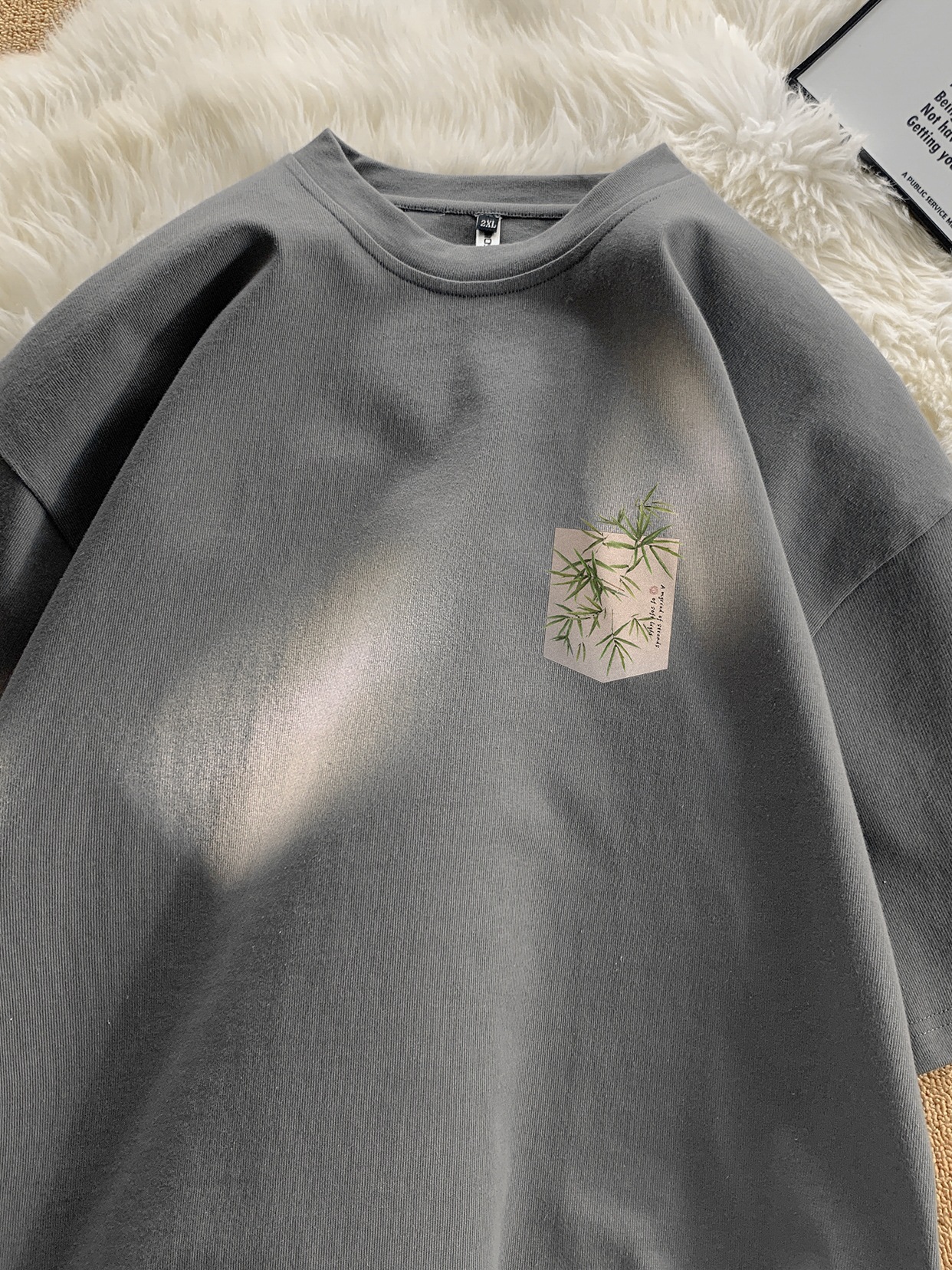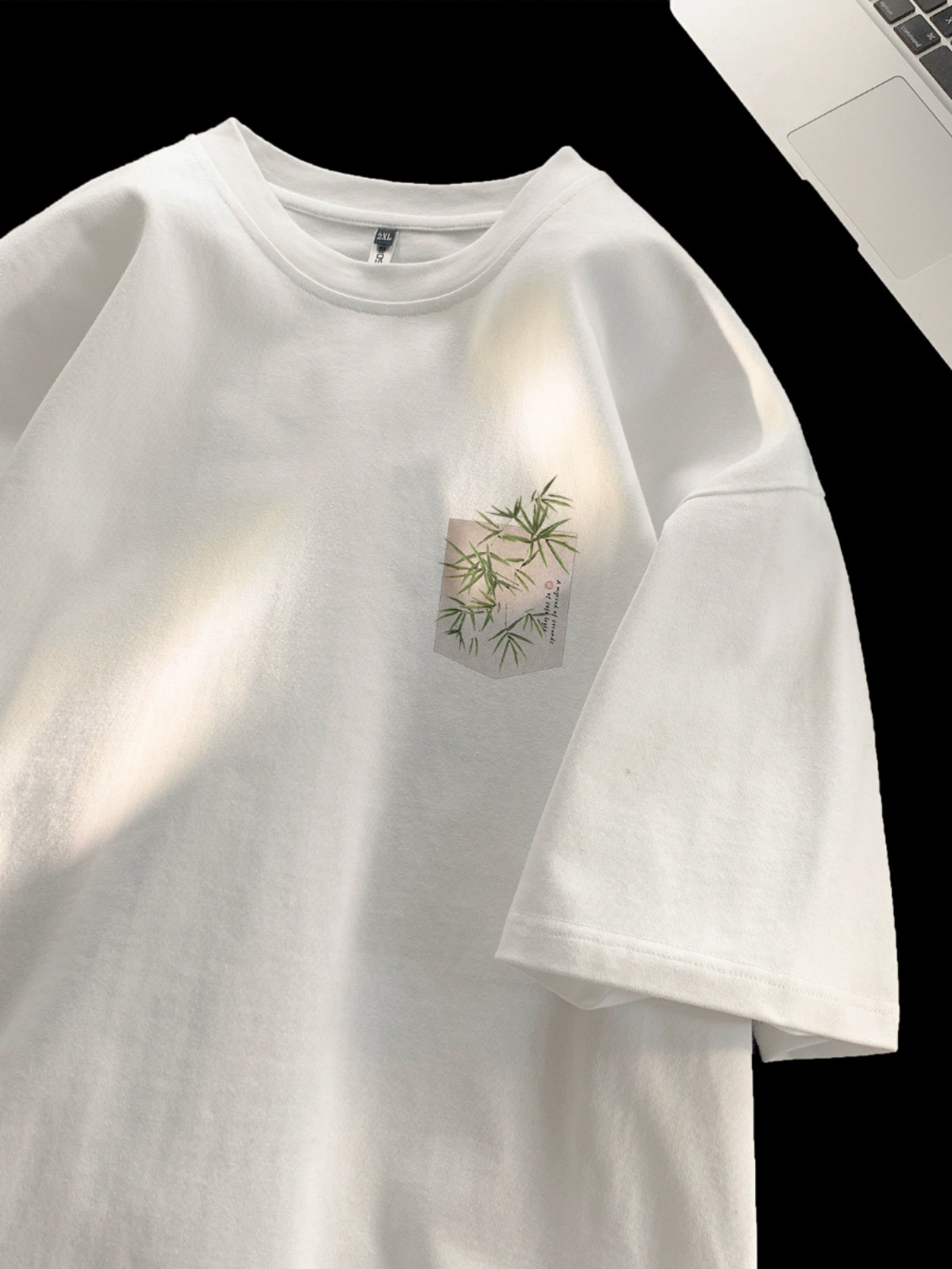 新中式竹子印花短袖t恤男夏季新款潮牌宽松重磅半袖青少年体恤衫