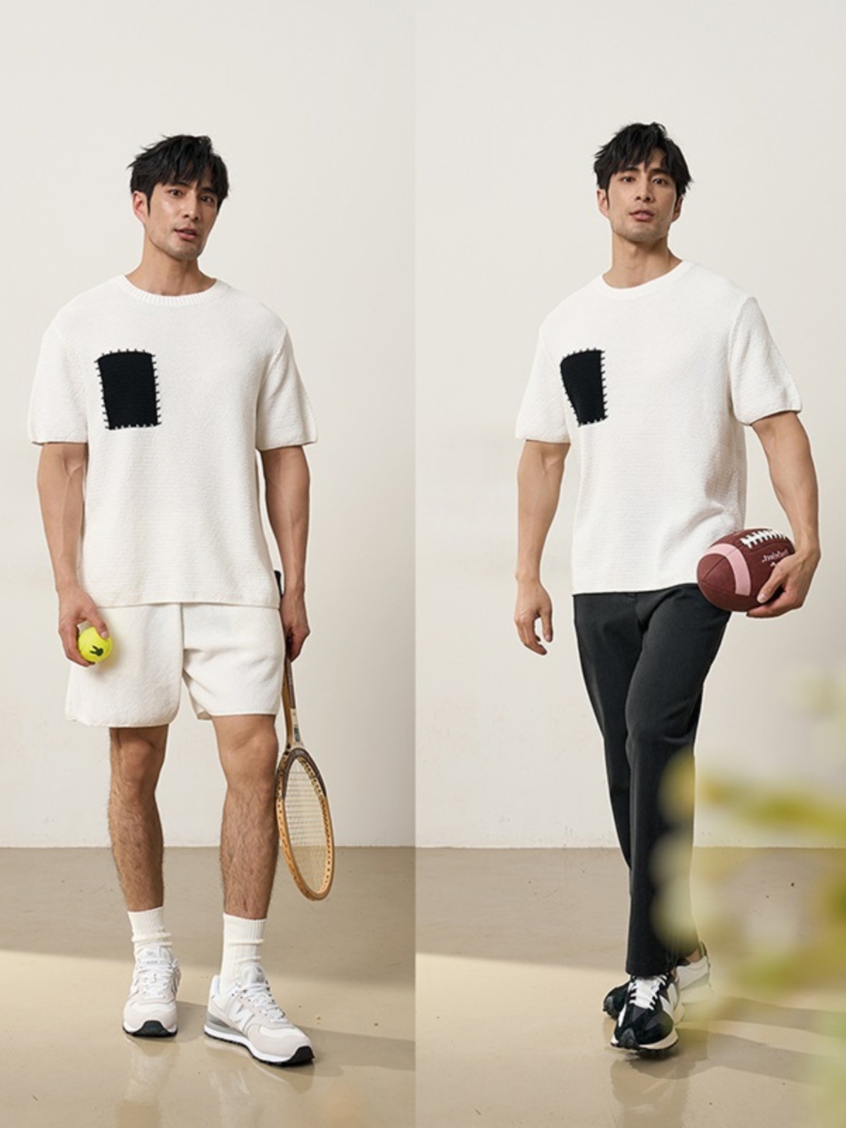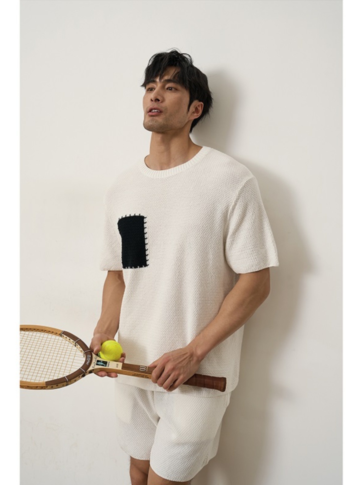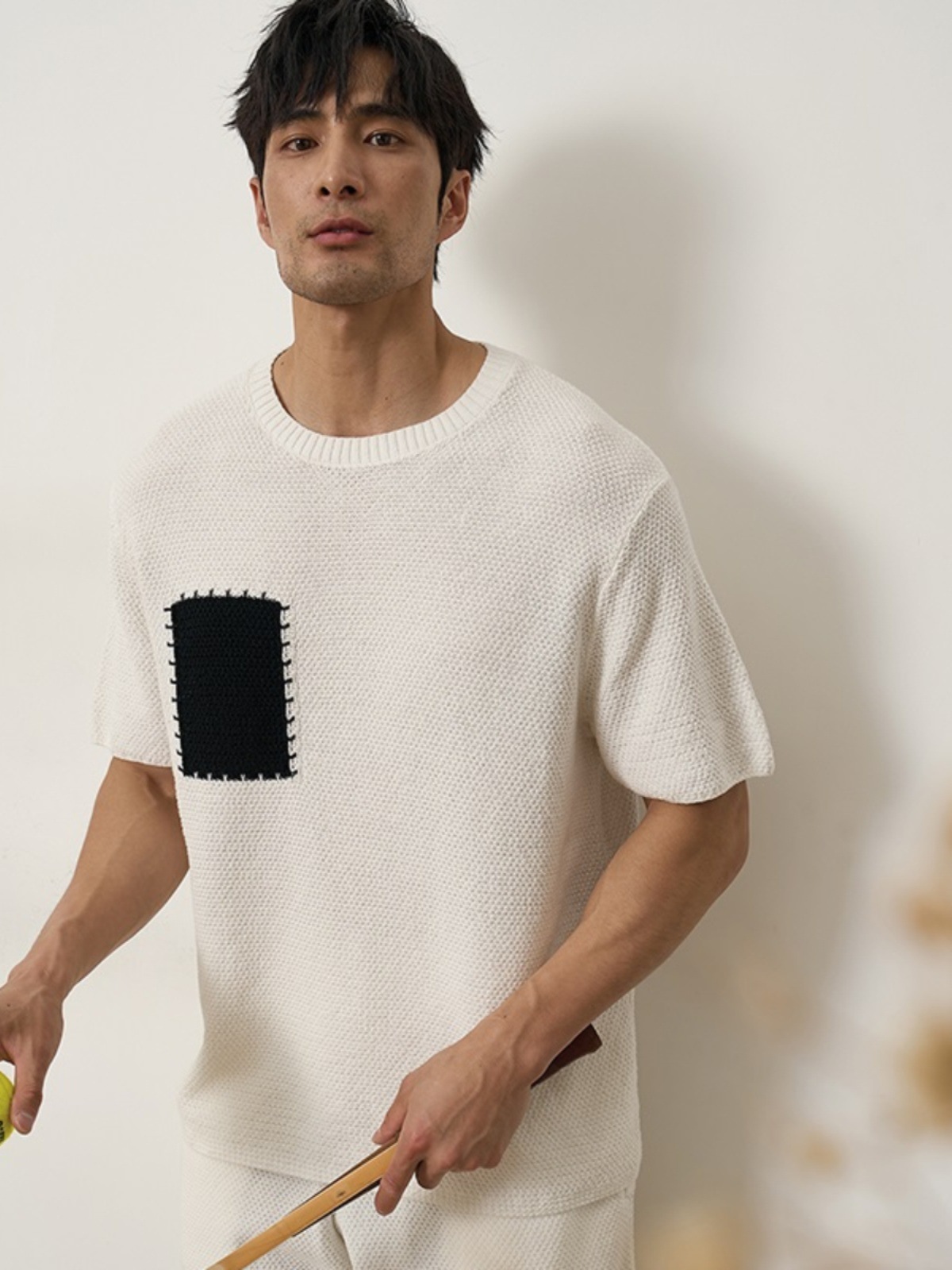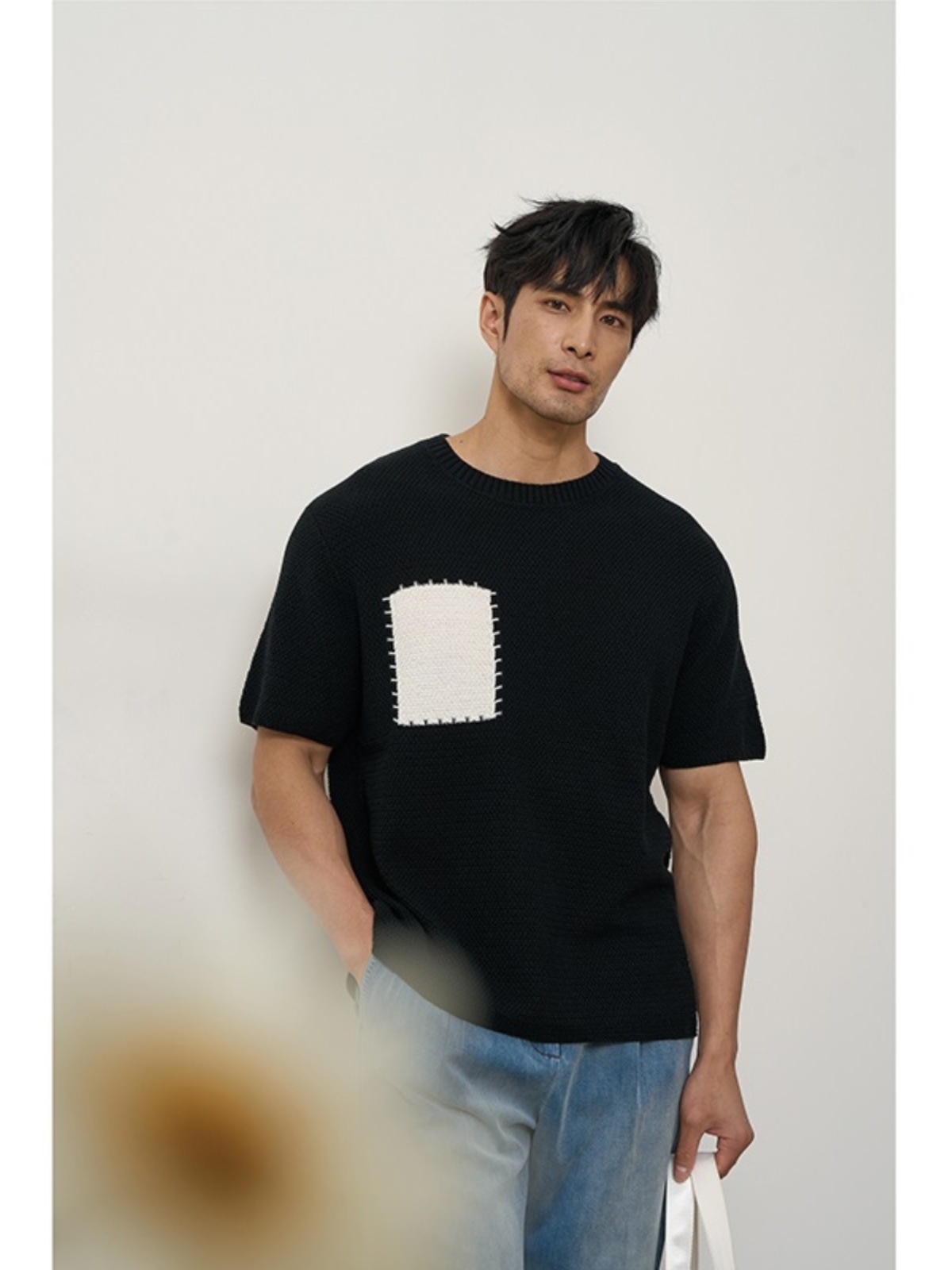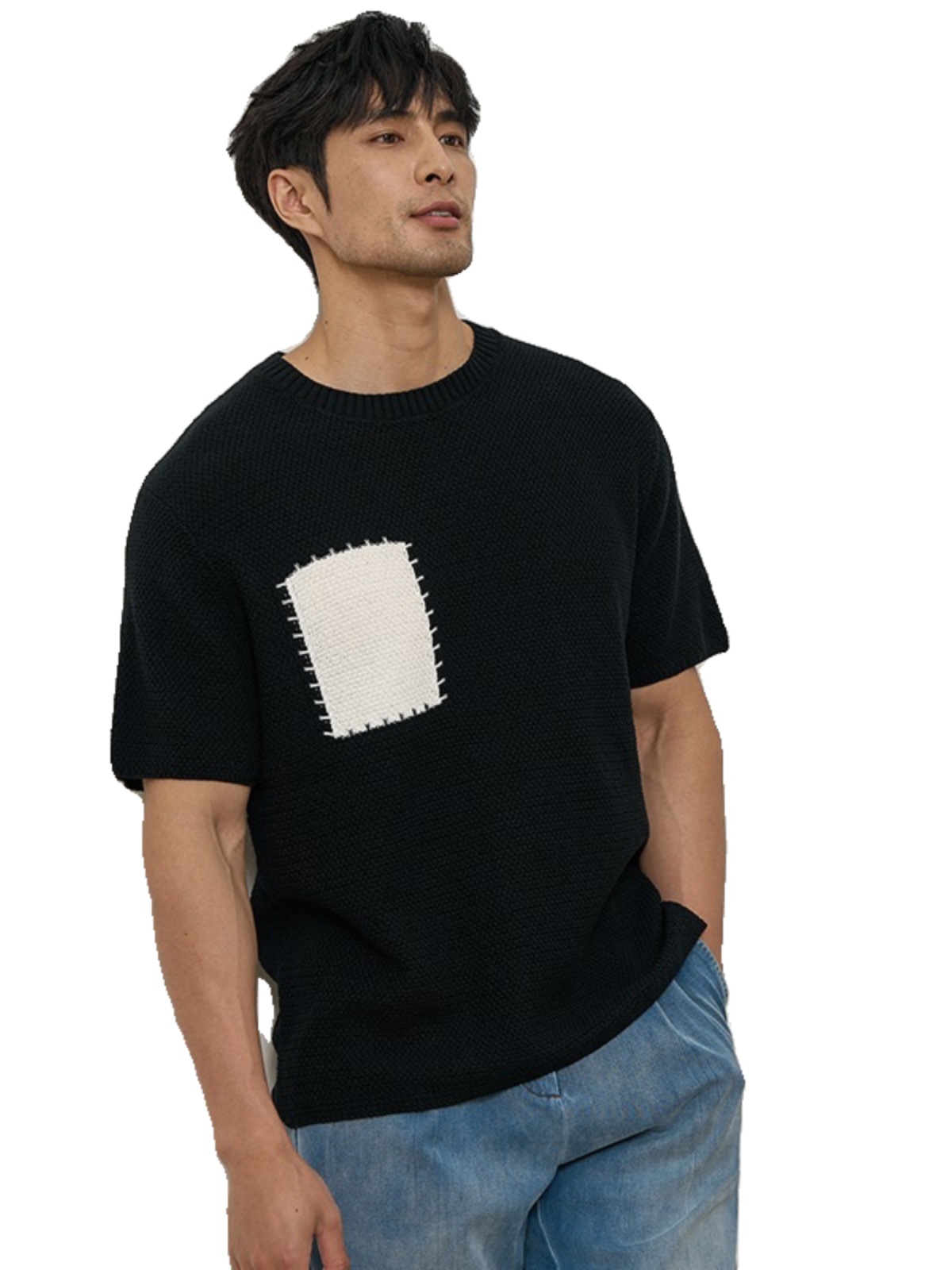 夏季美式菠萝纹假口袋阔形设计感时尚针织衫短袖T恤男士休闲上衣