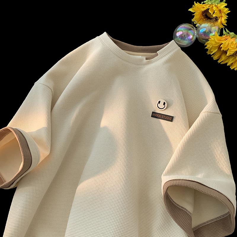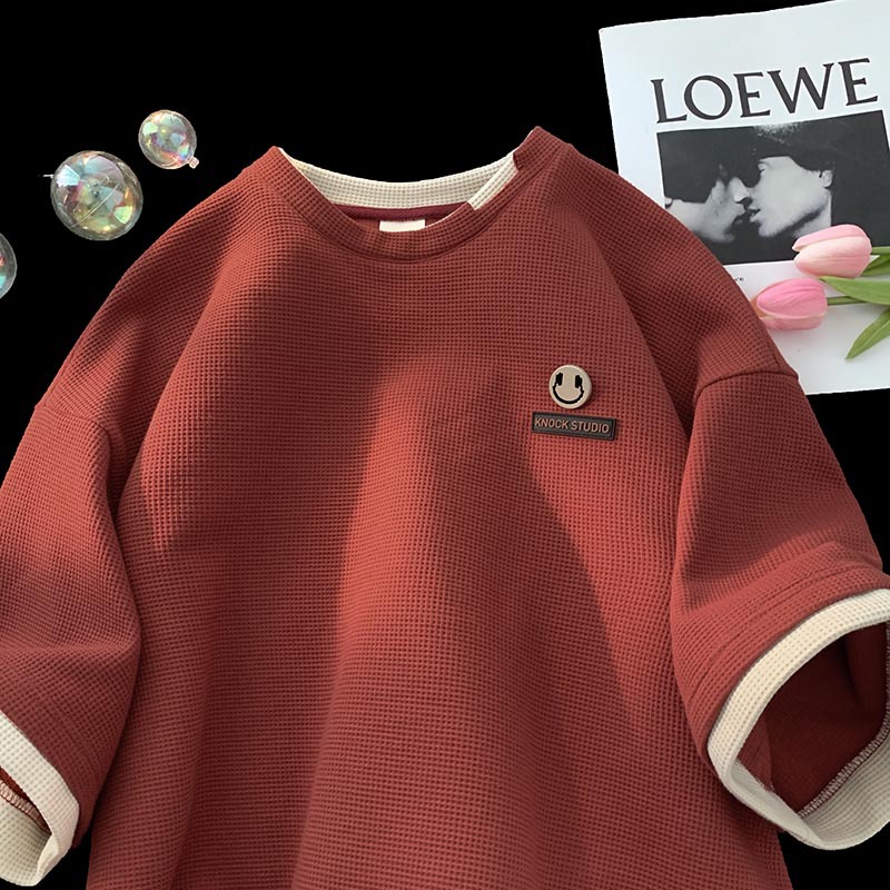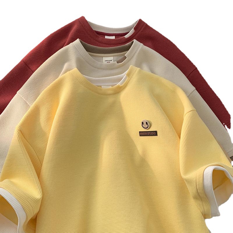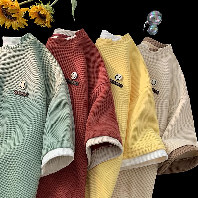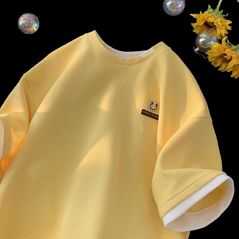 华夫格短袖男款夏季破洞假两件t恤潮牌潮流宽松半袖美式重磅衣服