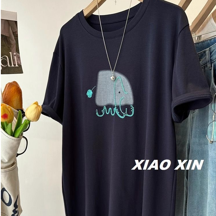 大码纯棉刺绣夏季新款韩系小象趣味短袖T恤女设计感小众减龄上衣