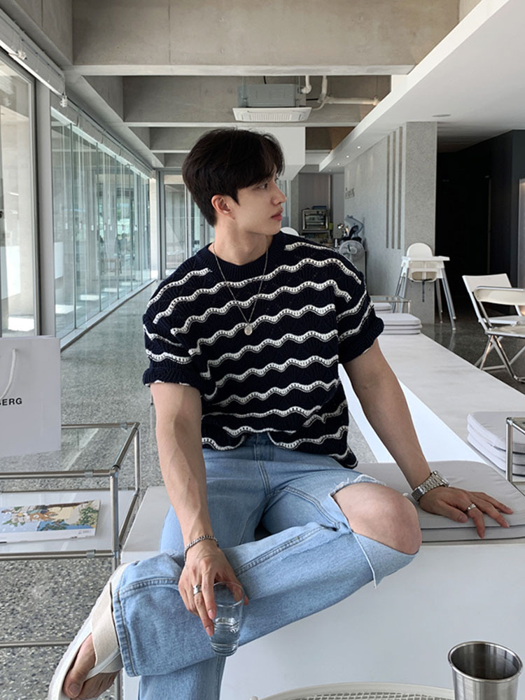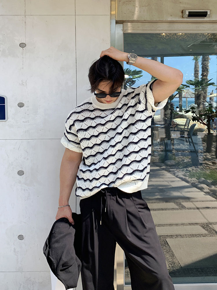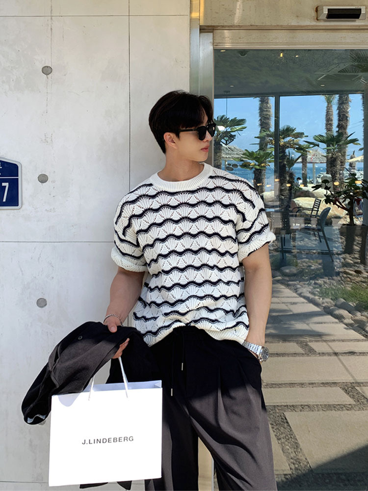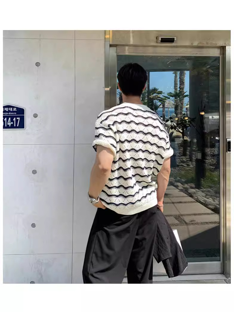 针织圆领短袖T恤男士新款黑白条纹体恤痞帅百搭休闲潮流上衣