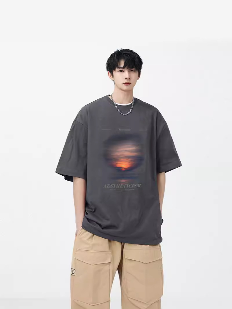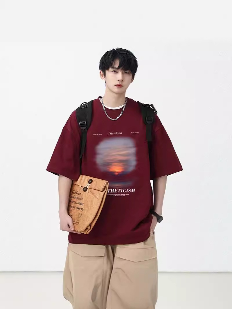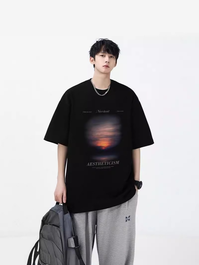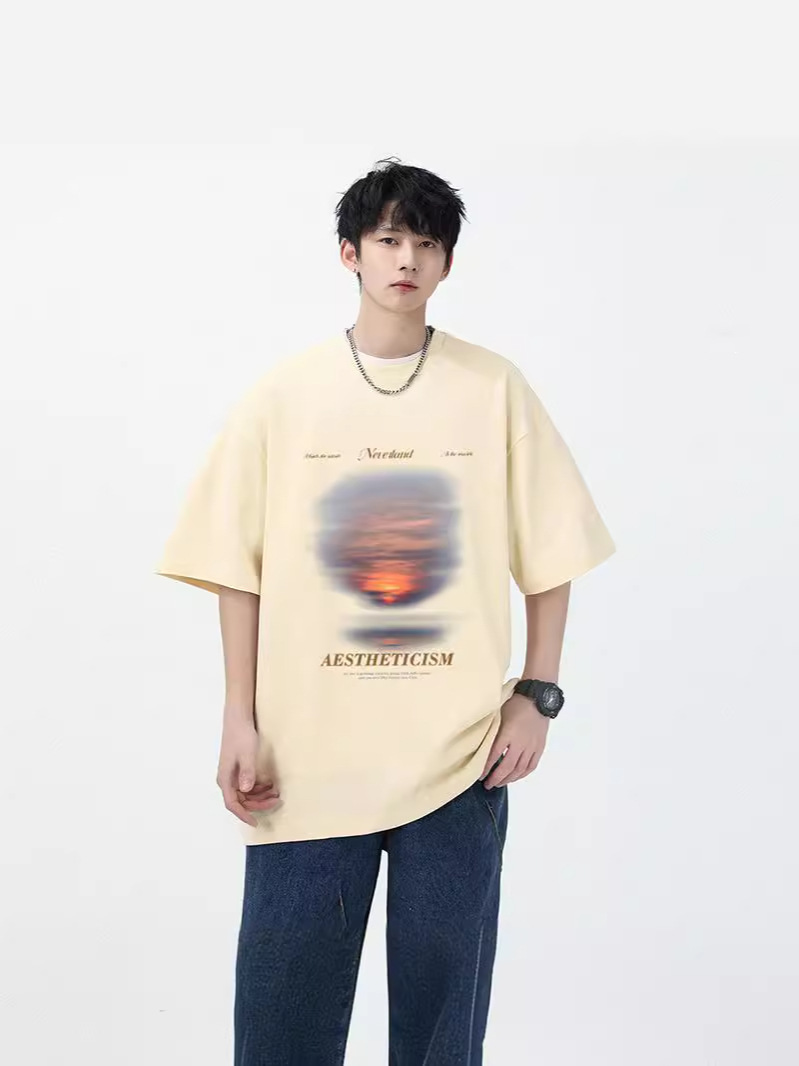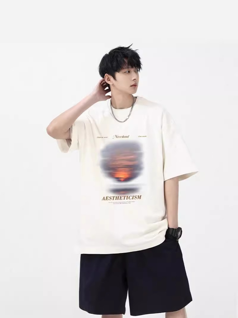夏季新款美式ins潮牌简约纯色短袖t恤男宽松设计感纯棉小领口上衣