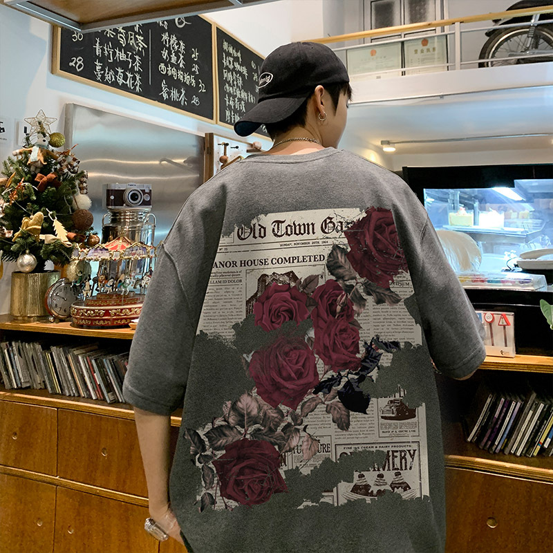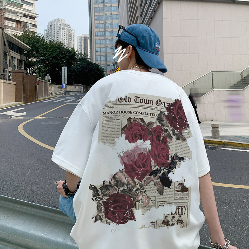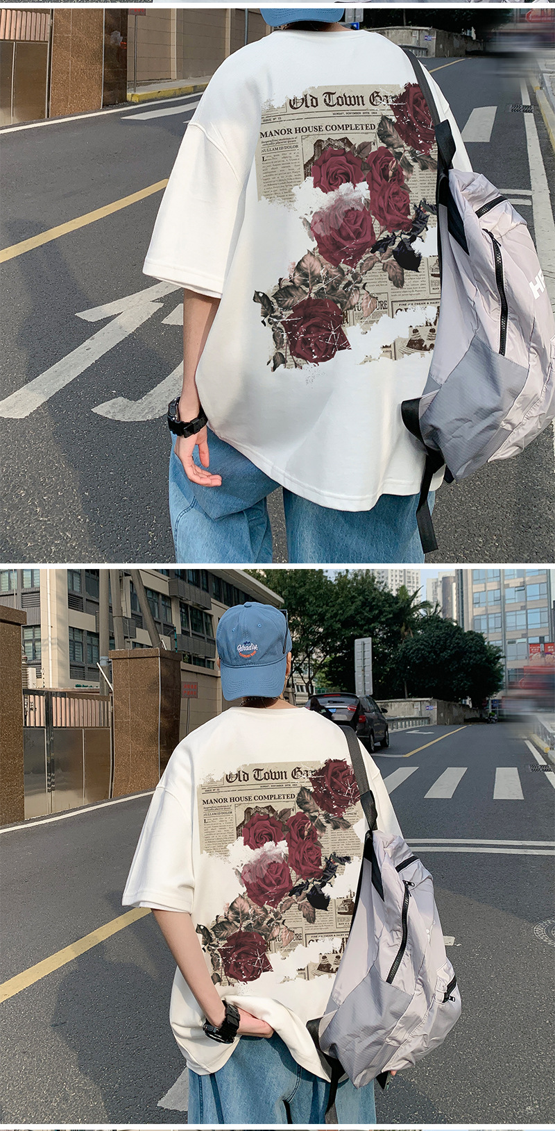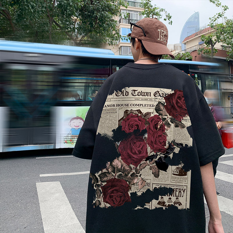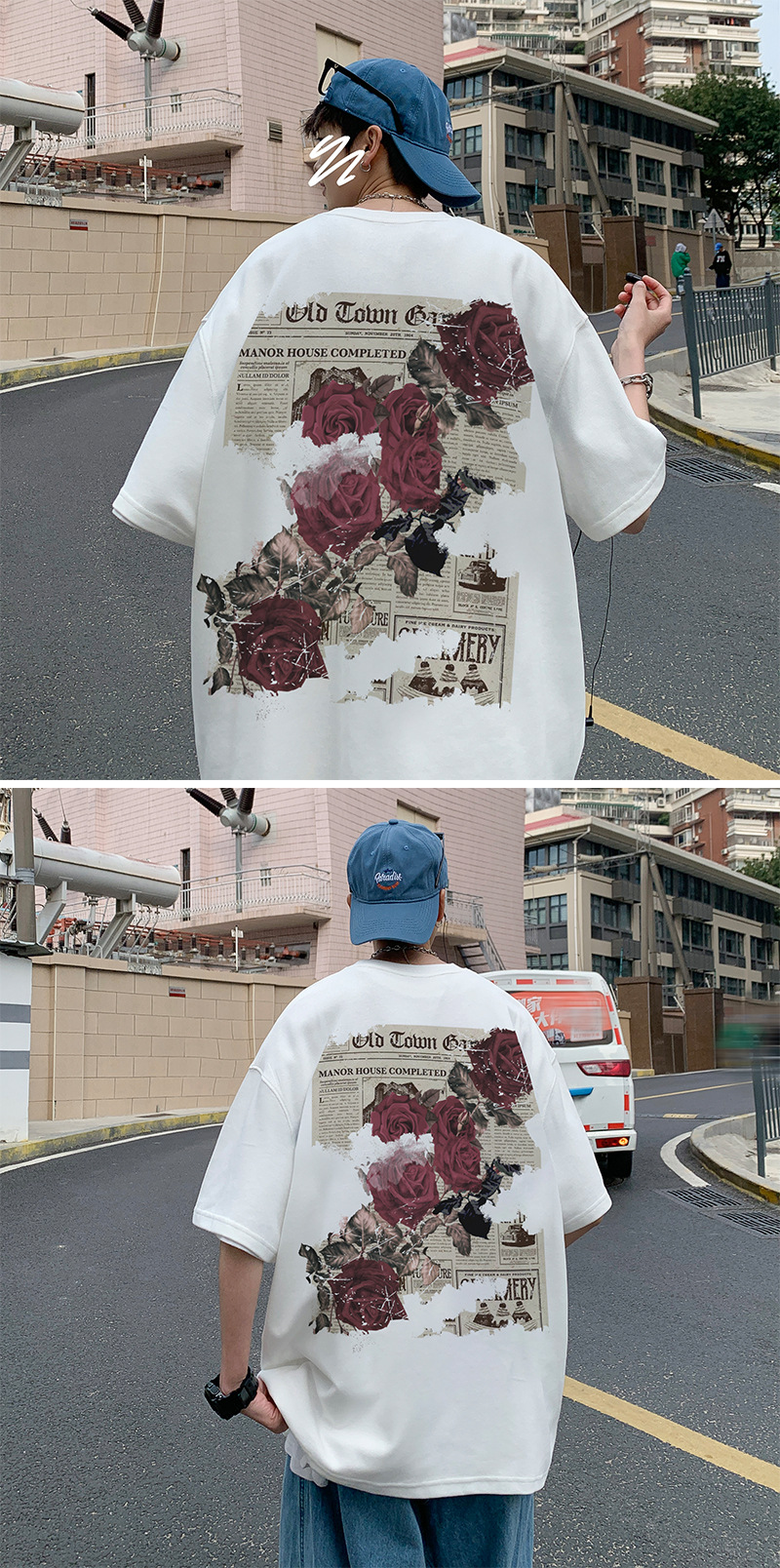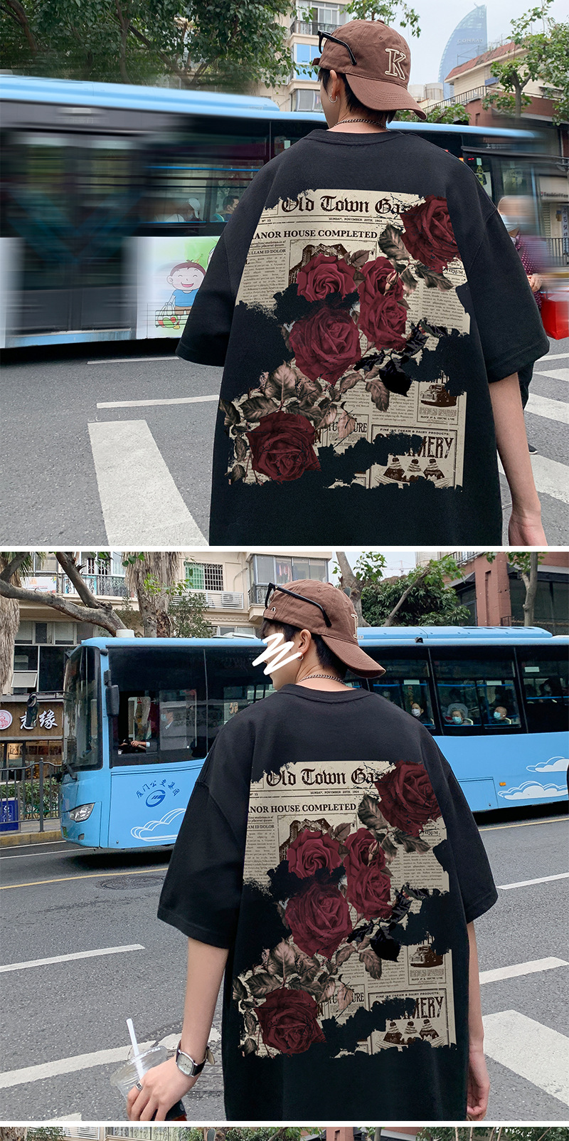 玫瑰印花重磅短袖t恤男款夏季新款oversize美式复古潮牌潮流体恤