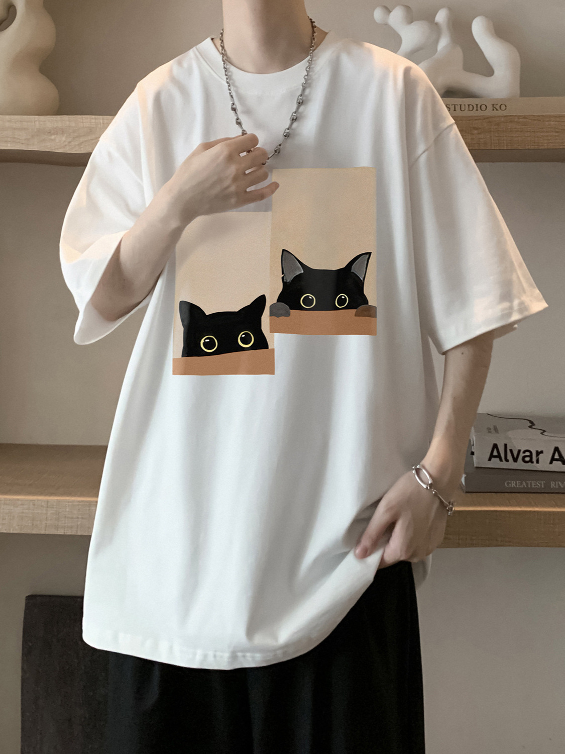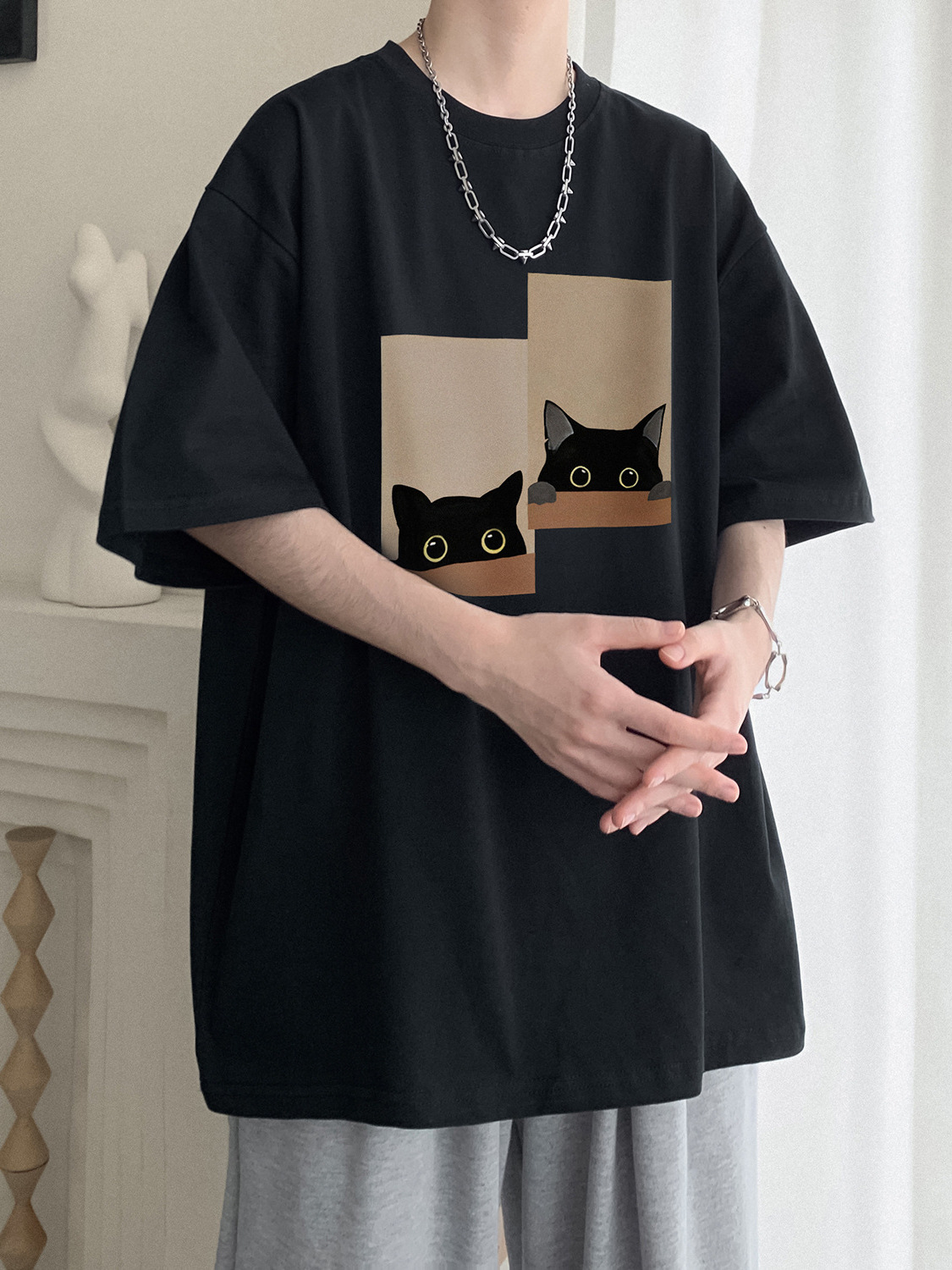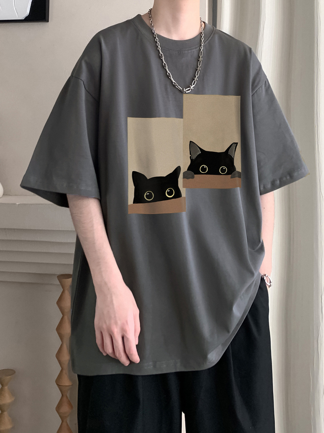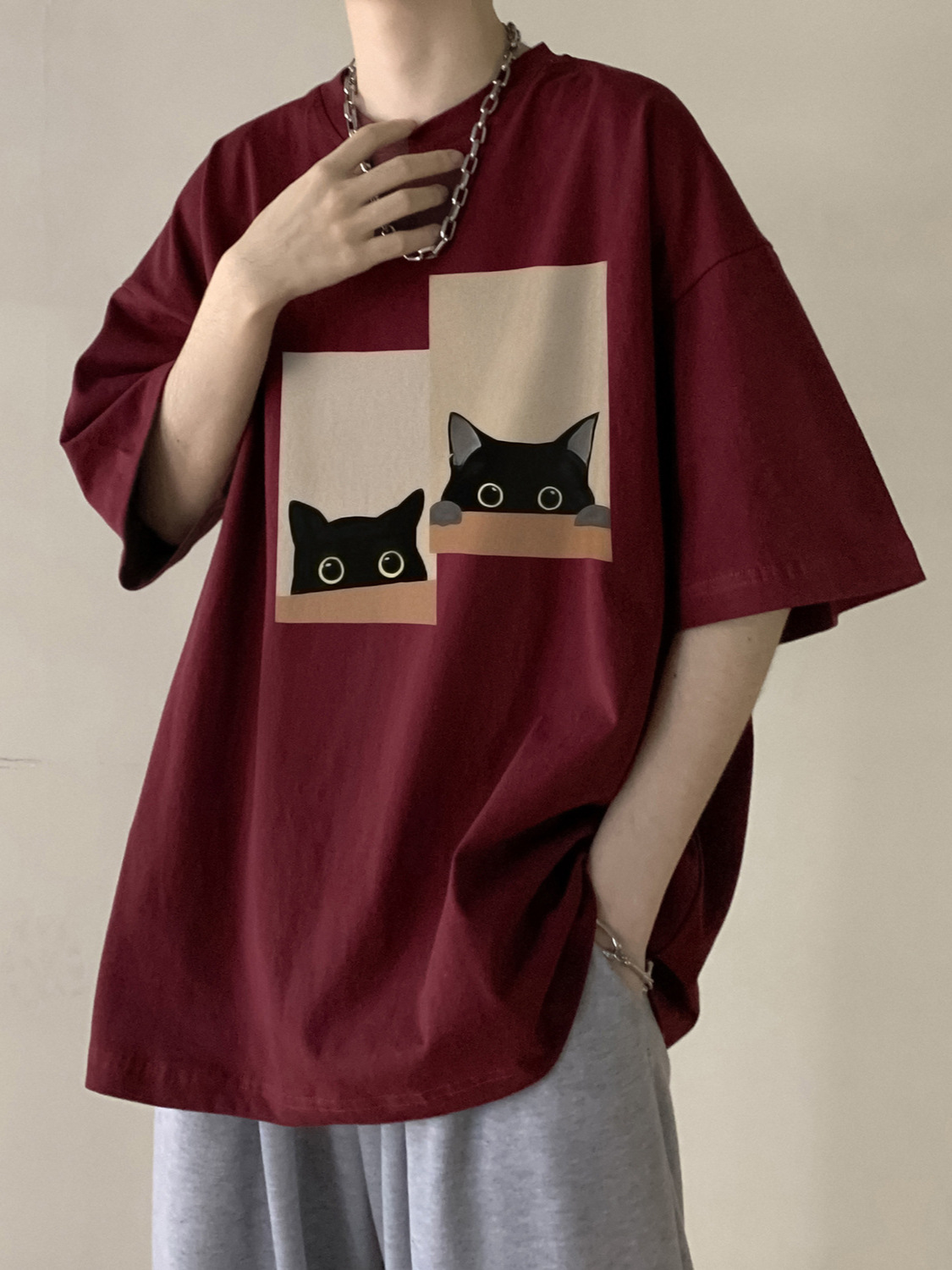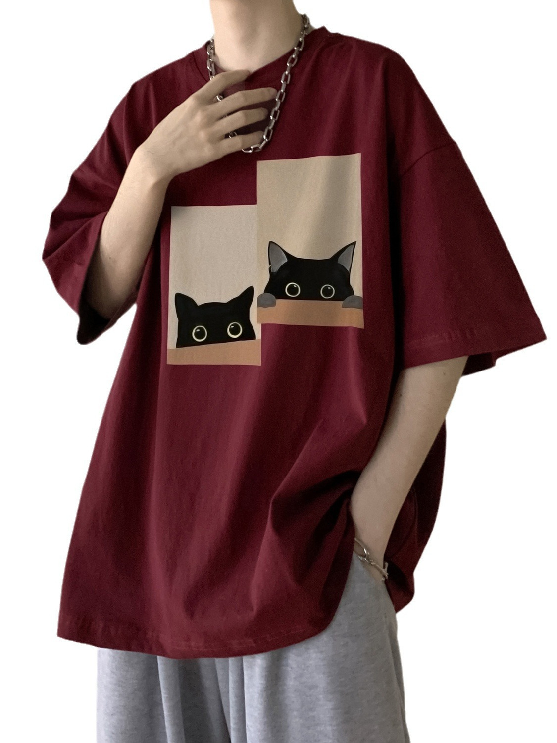 酒红色廓形短袖T恤男生夏季男士情侣衣服新款青少年宽松半袖
