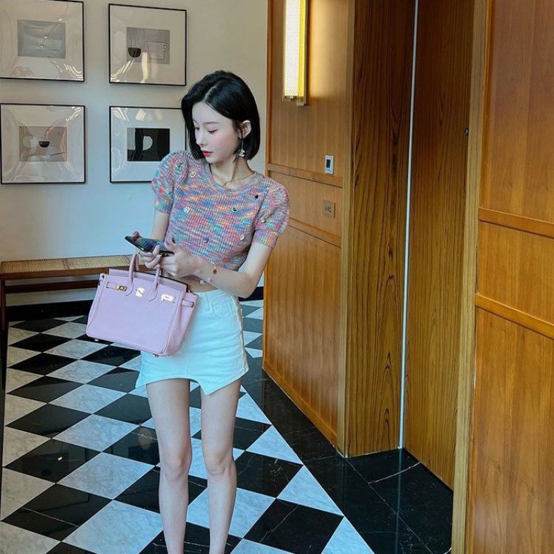 复古修身宝石重工小香风短袖T恤女春夏小众短款彩虹针织衫七彩