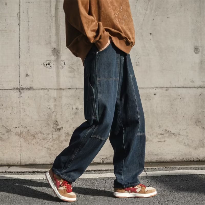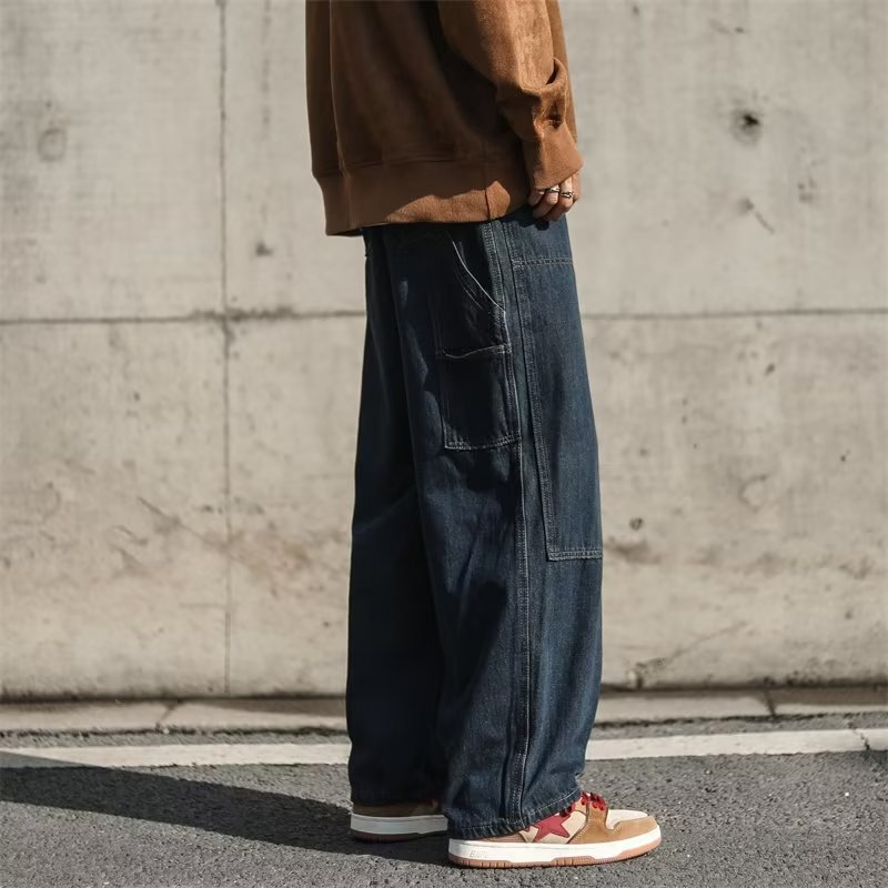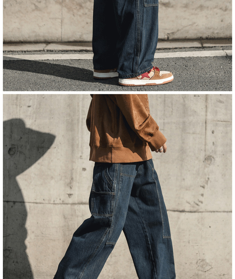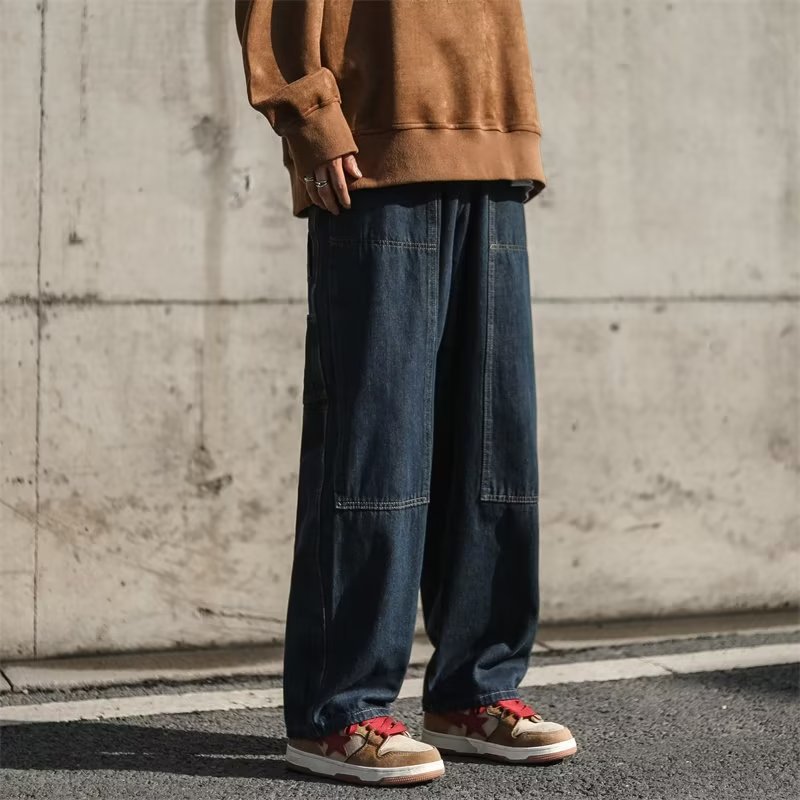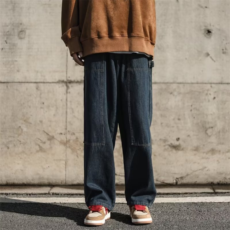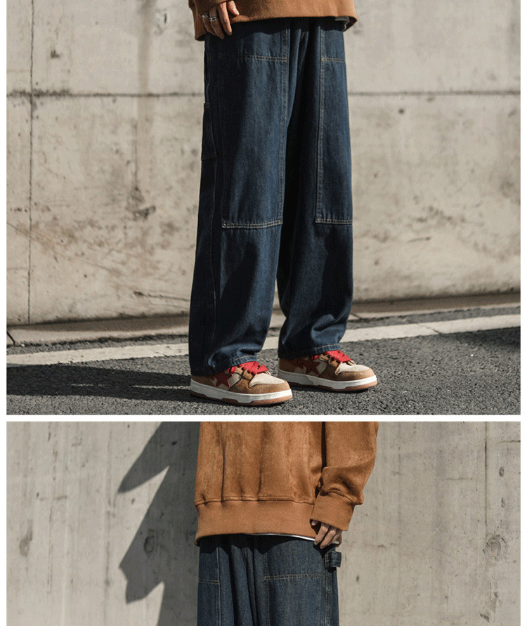日系复古街头水洗拼接工装潮流牛仔裤男生潮牌宽松休闲阔腿直筒裤