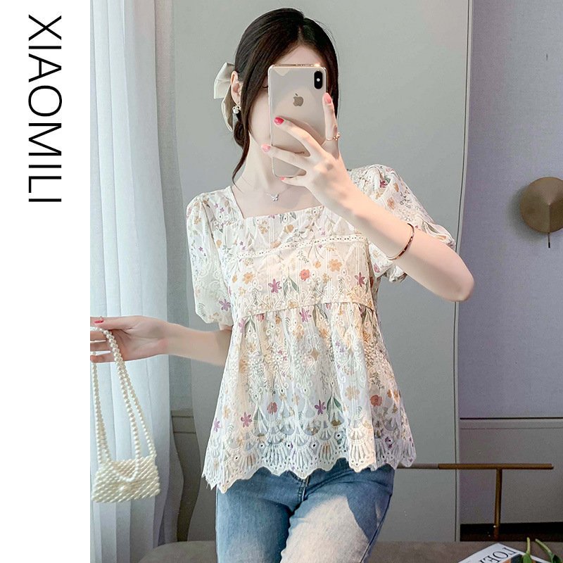 法式方领碎花雪纺衫女夏季气质镂空钩花小衫甜美泡泡短袖裙摆上衣