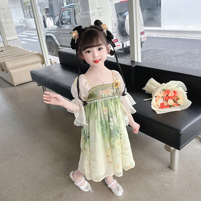小女孩夏季新款中国风唐装古风汉服向日葵花裙连衣裙表演服