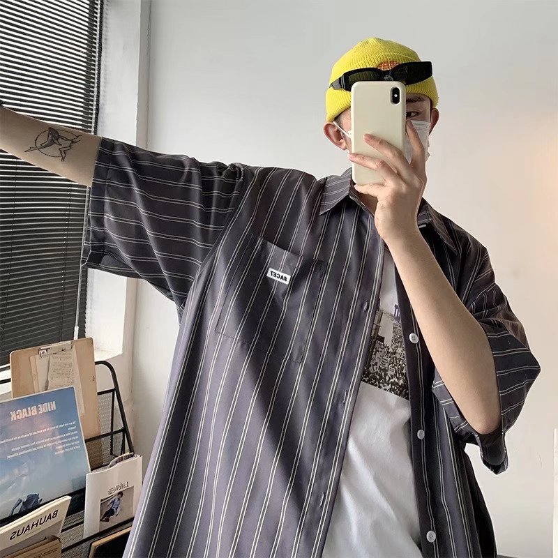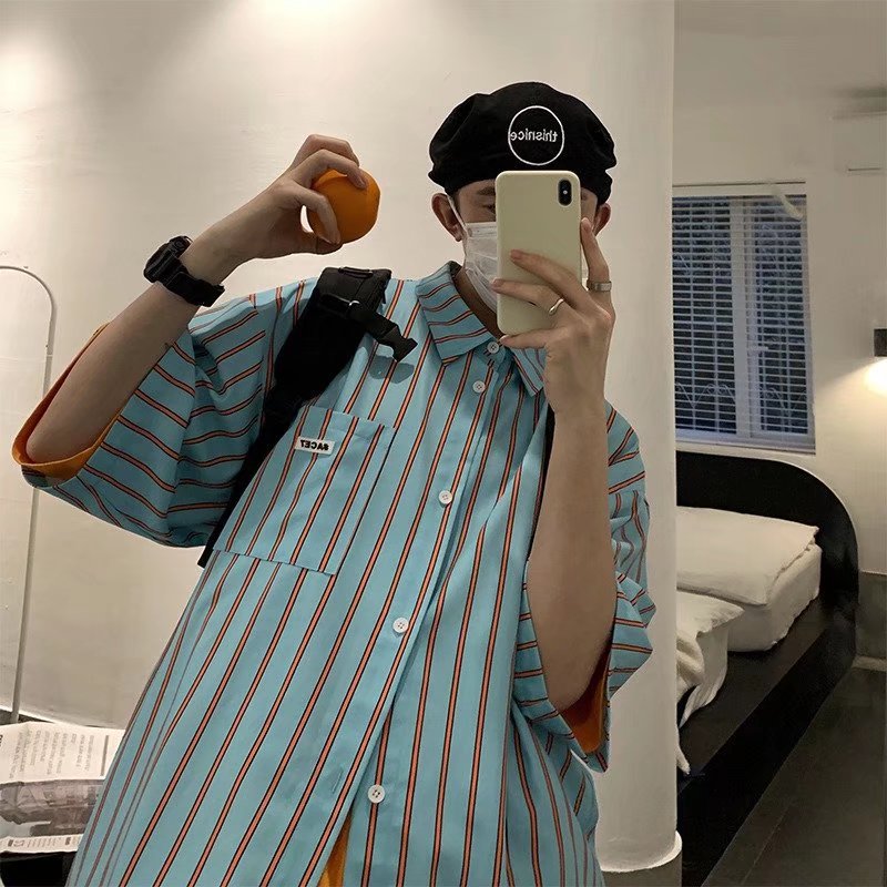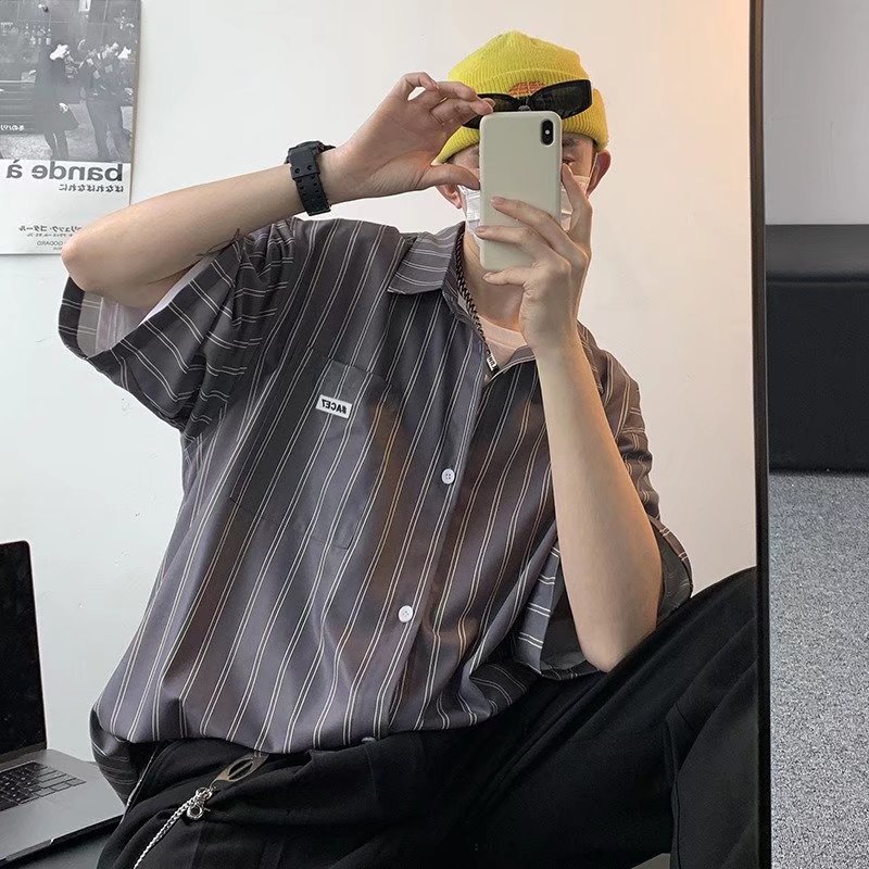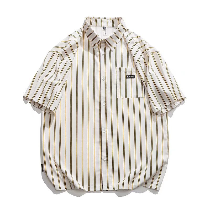 条纹短袖衬衫男夏季薄款港风日系衬衣外套ins潮流设计感小众上衣