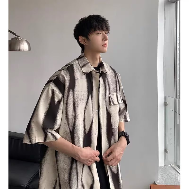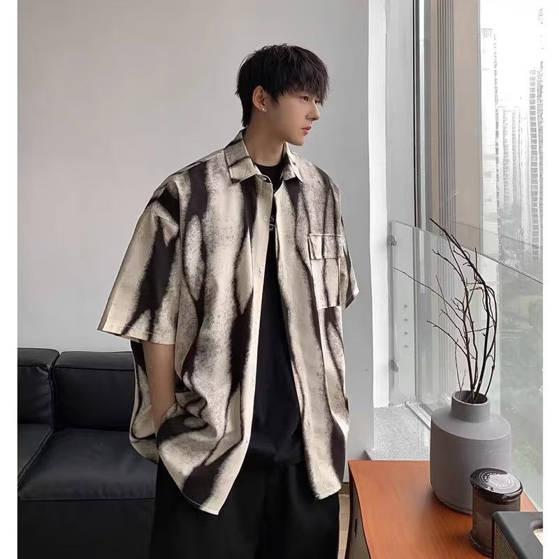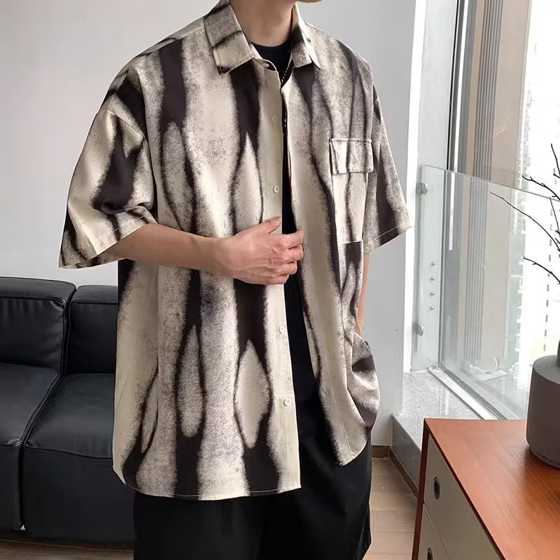 高级感扎染短袖衬衫男款夏季潮牌ins潮流五分袖痞帅炸街衬衣