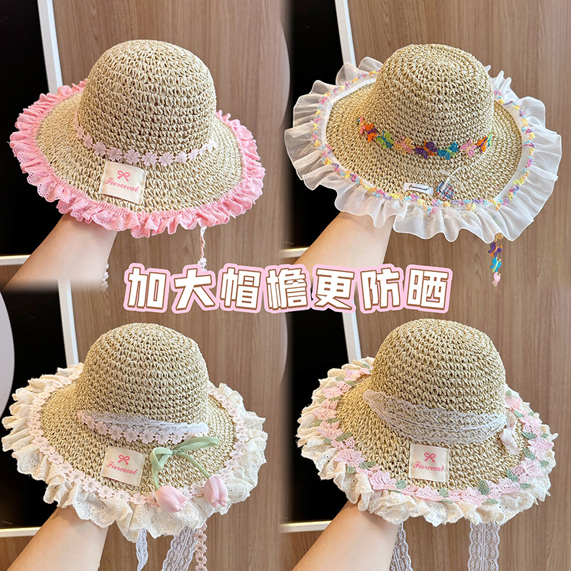 儿童帽子夏季草编大帽檐渔夫帽女公主出游沙滩遮阳防晒宝宝太阳帽