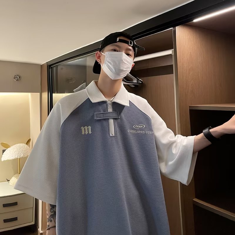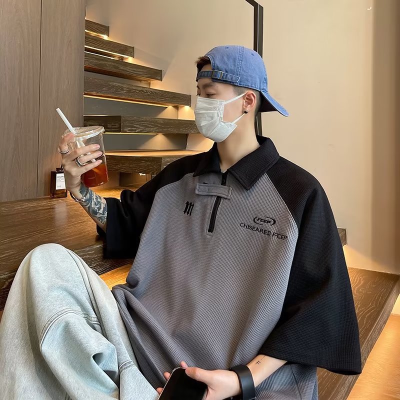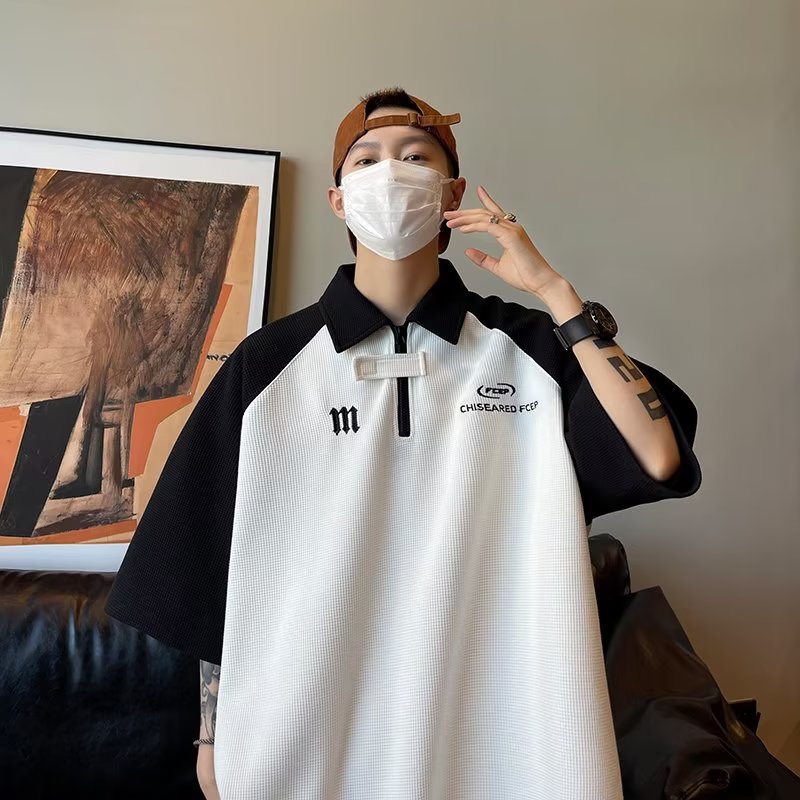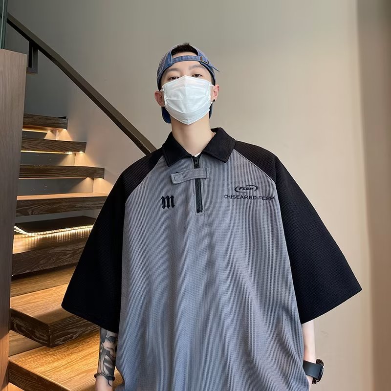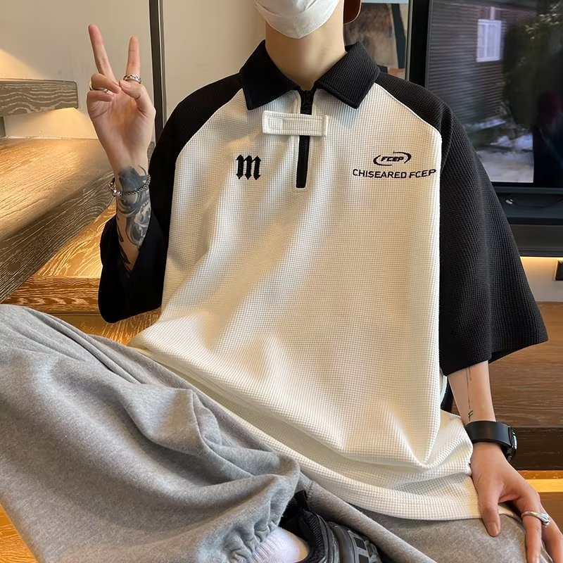 美式撞色华夫格polo衫男短袖夏季潮牌潮流设计感宽松翻领衬衫T恤