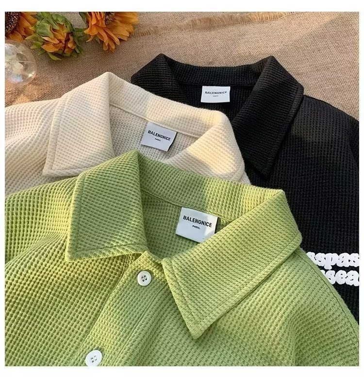 华夫格短袖t恤男款潮牌ins贴标翻领Polo衫夏季宽松潮流半袖体恤衫