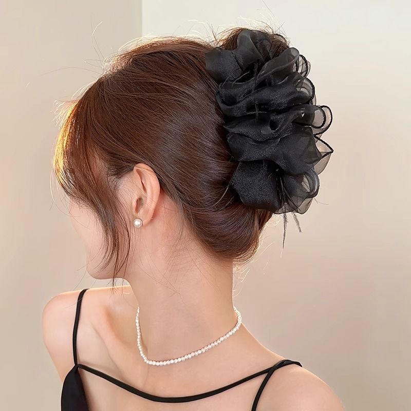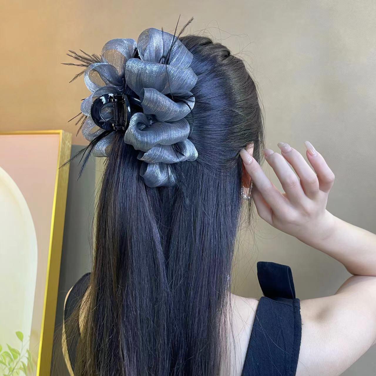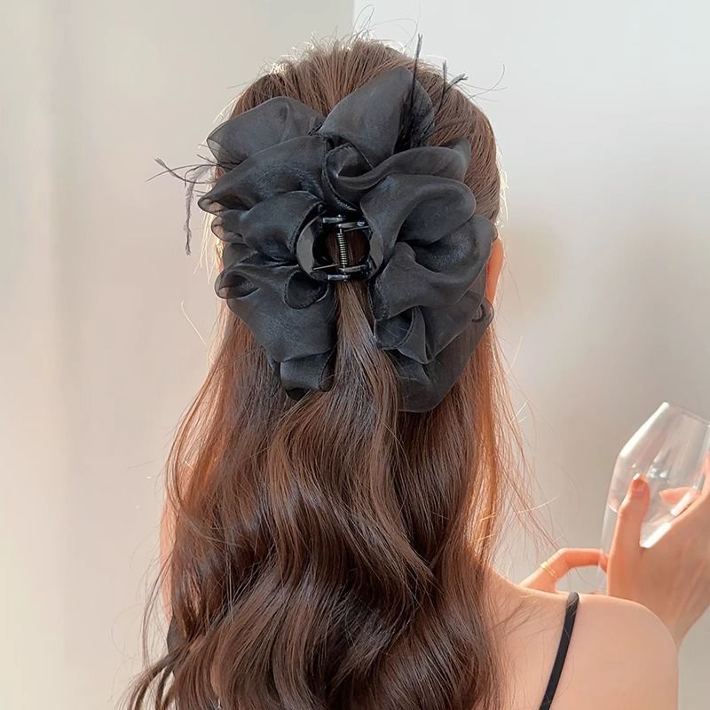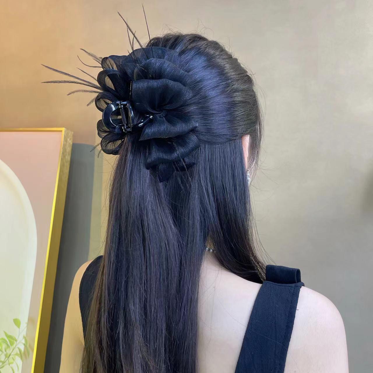 新款泡泡羽毛发夹蝴蝶结云朵网纱后脑勺发饰高级发卡鲨鱼夹子头饰