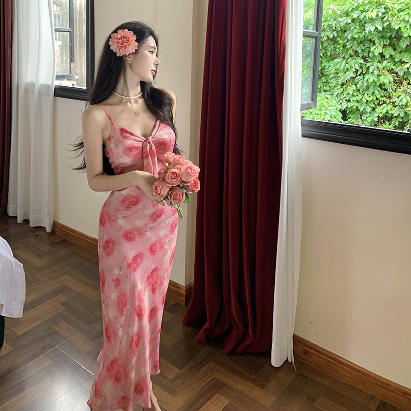 显白纯欲温柔性感度假印花吊带连衣裙长裙